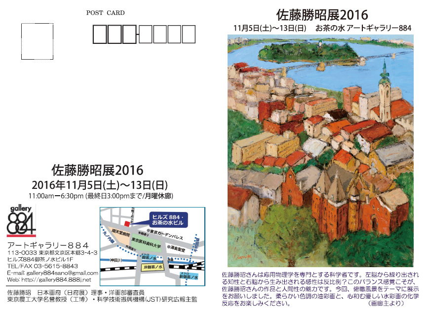 | 美術年鑑社のWeb siteArt Annualで紹介されました。 応用物理学の研究者であるとともに、日府展を中心に精力的な創作活動を続ける佐藤勝昭(1942年 生まれ、日本画府理事・洋画部審査員、東京農工大学名誉教授)の新作展が、東京・御茶ノ水のア ートギャラリー884で開催されている。 京都大学および京都大学大学院で電気工学を修め、NHKでの勤務を経て84年より東京農工大学工学部 で教鞭を執り、89年に教授、2005年に同大学理事副学長に就任。現在は科学技術振興機構(JST)の 研究広報主監を務め、また、『太陽電池のキホン』(ソフトバンククリエイティブ)や『磁性超入門 ~ようこそまぐねの国に~』(共立出版)など多数の著書も手掛けている。 一方で佐藤は、小学生の頃より油絵を学び、NHK美術部で中島哲朗、日本画府前理事長の樋渡涓二に 師事して日府展に出品。これまで日府賞、記念賞、愛知県知事賞等受賞など受賞を重ねてきた。学会 や国際会議で様々な土地を訪ねるたびに暇さえあればスケッチを重ね、たっぷりとした厚塗りのタッチ でその風景を瑞々しく描き出す。特にヨーロッパの石造りの重厚感ある建物や色彩豊かな街並みは 「油絵の具は、こういう風景を描くために開発されたのではないかとさえ思う」と画家を魅了して やまないという。 今展では、ハンガリー・ブタペストの街並みを俯瞰的に捉えた《街の俯瞰》をはじめとするヨーロ ッパの街並みを中心に、街や植物を描いたスケッチもあわせて大小約25点を展示。「研究発表も絵画も、 何を訴えるのかが明確でなければなりません。また、どちらもある意味での“遊び”がなければなりま せん」と語る画家の、塗り重ねによって醸される欧州の街のどっしりした質感と、「描き切らない」 遊びの感覚を楽しんでほしい。 | |||||