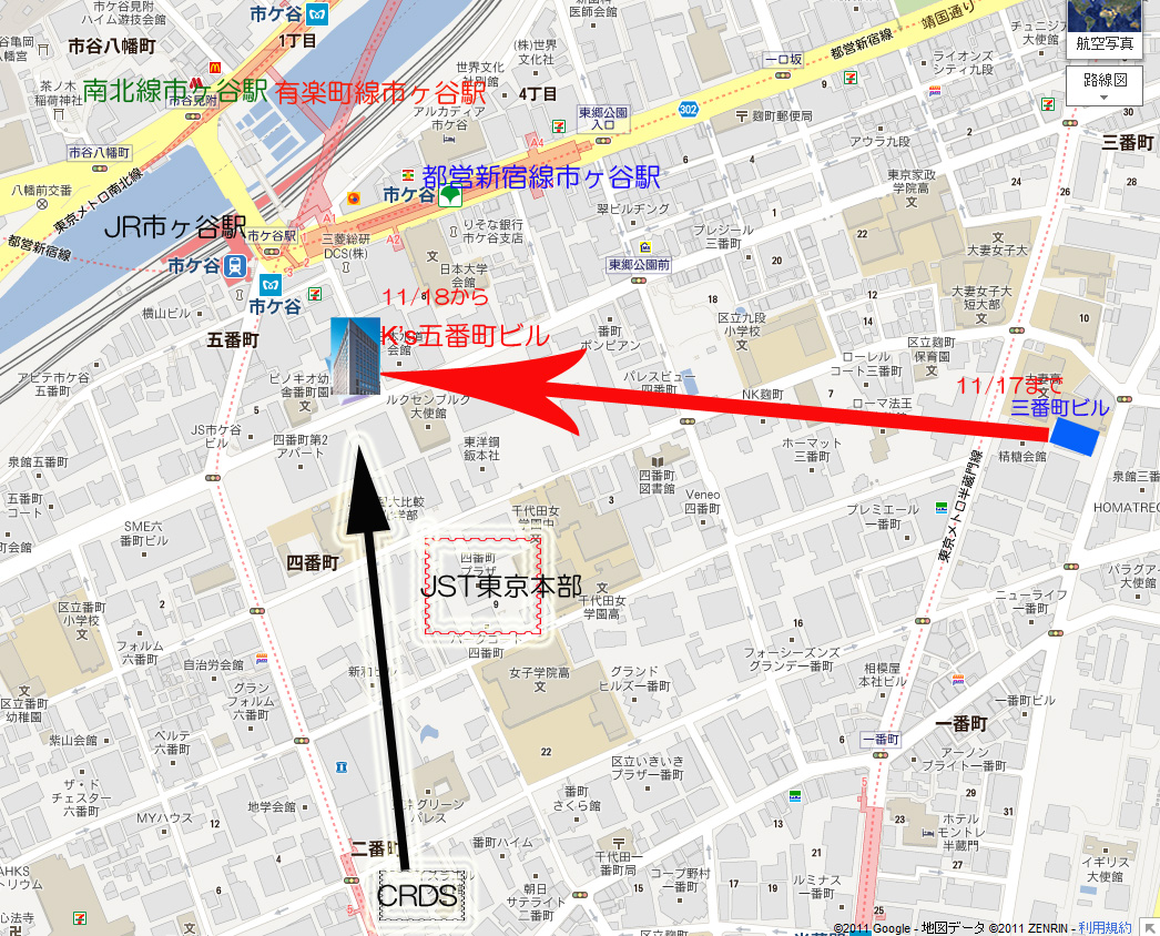 | 11.11.18 | さきがけ研究事務所が五番町に移転します。最寄りは、JR市ヶ谷駅です。 新住所:〒102-0076東京都千代田区五番町7 K's五番町5階 | |