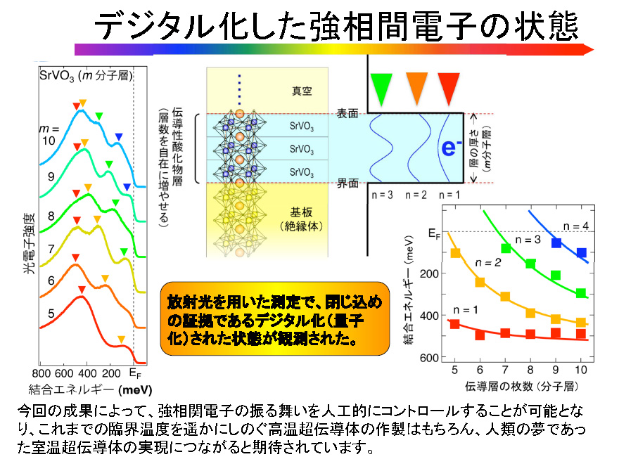 組頭広志研究者らは、電子同士が互いに強く影響し合う性質をもった「強相関電子」を2次元空間(層)に人工的に閉じ込める「量子井戸構造」を作製することに世界で初めて成功しました。レーザーを使った結晶成長の技術を駆使し、伝導性をもつ酸化物を原子層レベルで精密に制御しながら作製しました。高エネルギー加速器研究機構(KEK)の放射光注3による高精度な分光法で電子の振る舞いを詳細に調べ、強相関電子が2次元空間に閉じ込められていることを確認しました。 福井新聞、河北新報、日経産業、日刊工業に掲載されました。 | ![]() PESで量子化された準位を確認 Metallic Quantum Well States in Artificial Structures of StronglyCorrelated Oxide; Science 15 July 2011 |