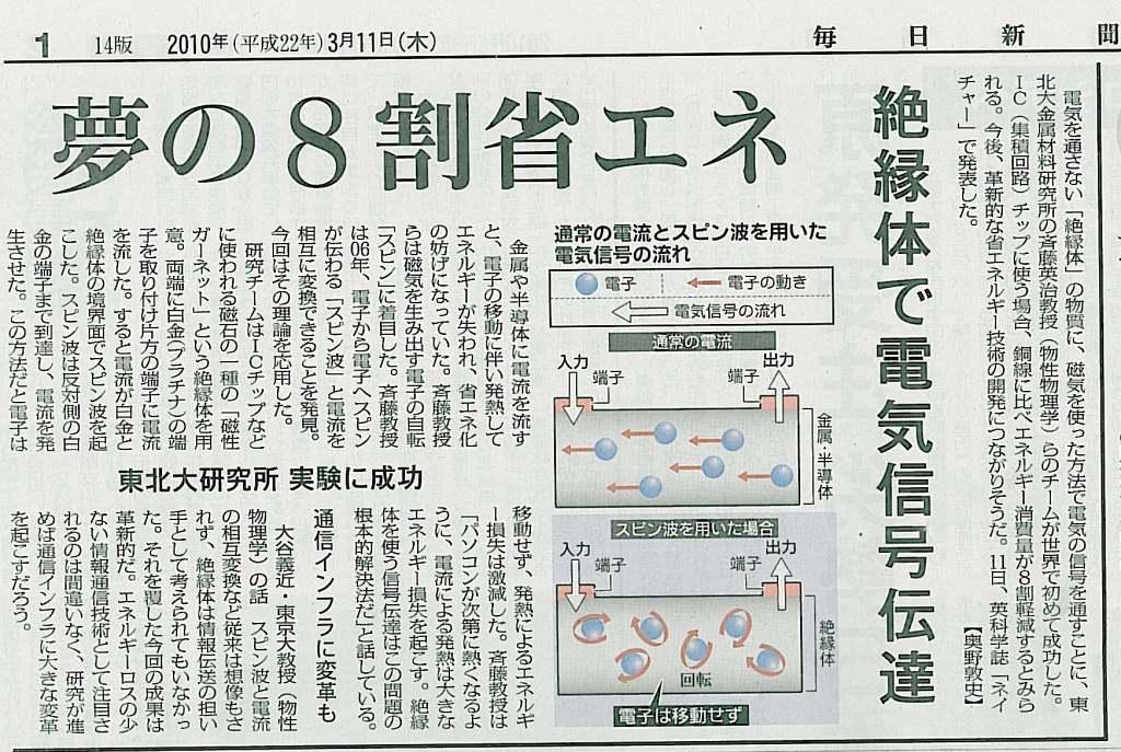 | 10.03.11 | 3/10午後、齊藤英治研究者が文科省記者クラブでプレスレク「絶縁体に電気信号を流すことに成功」 ■佐藤研究総括による解説 毎日新聞、河北新報が一面掲載。東京新聞、日経産業新聞に掲載されたほか、共同通信、時事通信、アサヒコム、日刊工業新聞のネットニュースに流れました。3/12には読売新聞夕刊、3/13には産経新聞にも掲載されました。 | |