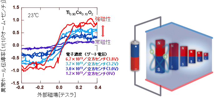 | 11.05.27 | 福村研究者の研究成果が 「電圧で磁気を制御できる新しいトランジスターの開発に成功 」 -室温での電気的な磁性のスイッチングに道- というタイトルでプレス発表(JSTと東大・東北大との共同)されました。 日経産業、日刊工業、化学工業、科学新聞に掲載されました。 | 電圧で磁性が制御される様 |