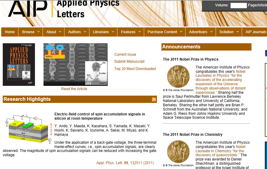 | 11.10.09 | 浜屋研究者の論文がApp?lied Physics LettersのHighlightsに選ばれ、APLのホームページのトップページを飾りました。 | ![]() |