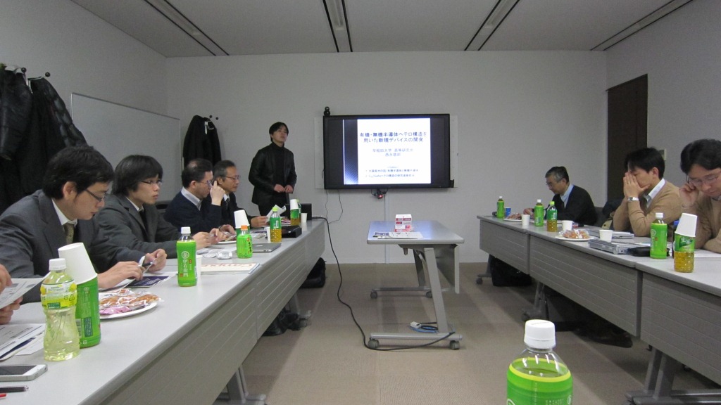 | 09.11.12 | サイトビジット 早大・理工・西永慈郎 採択課題「有機・無機半導体ヘテロ構造を用いた新規デバイスの開発」 | ![]() 堀越佳治教授と記念撮影 |