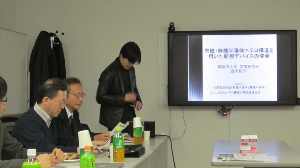 | 12.04.24 | 早稲田大学理工学部に西永慈郎研究者を訪ね、有機・無機半導体ヘテロ構造デバイス研究の進捗状況について話を伺い、今後の方向性を話し合った。デバイスの前に、基礎的な電子状態を明確にする研究に注力する方向で研究を進める方針を話し合った。 |