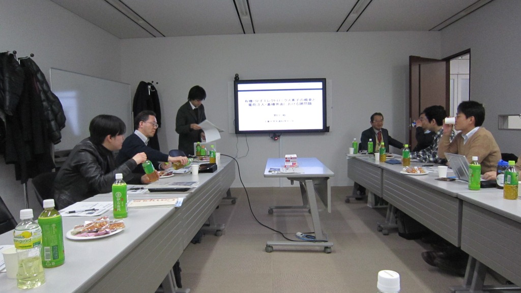 | 12.01.24 | 13:00から17:30、第8回ミニワークショップがK's五番町4F A会議室で開催された。今回のテーマは、「有機・分子デバイス」で、西永、野口、中野の3研究者によって企画された。 (1)西永研究者:有機・無機半導体ヘテロ構造を用いた?新規デバイスの開発(無機半導体GaAsにC60をデルタドープ。GaAsのRHEEDストリークはC60のドープ後も連続。C60分子軌道とGaAsのバンドの関係を明らかにするのが課題。有機半導体にフェルミ準位の考?えは適用できるか) (2)野口研究者:有機エレクトロニクス素子の概要と電荷注入・蓄積界面における諸問題(有機半導体のp型、n型は電極との関係で決まる。同じペンタセンが電極の選択?で両極性になる。積層型の場合エネルギーダイヤグラムのバンドベンディングは、仕事関数だけでは決められない。?・・・) (3)中野研究者:分子配列制御による有機トランジスタの高性能化(ペンタセンを超える安定で高移動度の有機半導体の創製を目指す。ヘテロアセンに元素・置換基による?物性制御。液晶性分子を使って分子配列制御し高移動度を?めざす。移動度はTRMC移動度とFETの電界効果移動度とで大きな違いがある。デバイスとして移動度が大きくなければ無意味。) 無機の研究者と有機の研究者とで、エネルギーダヤグラムのとらえ方が大きく異なっており、対話とアドバイザの助言により、かなり互いの解釈の間に歩み寄りが得られた。 |