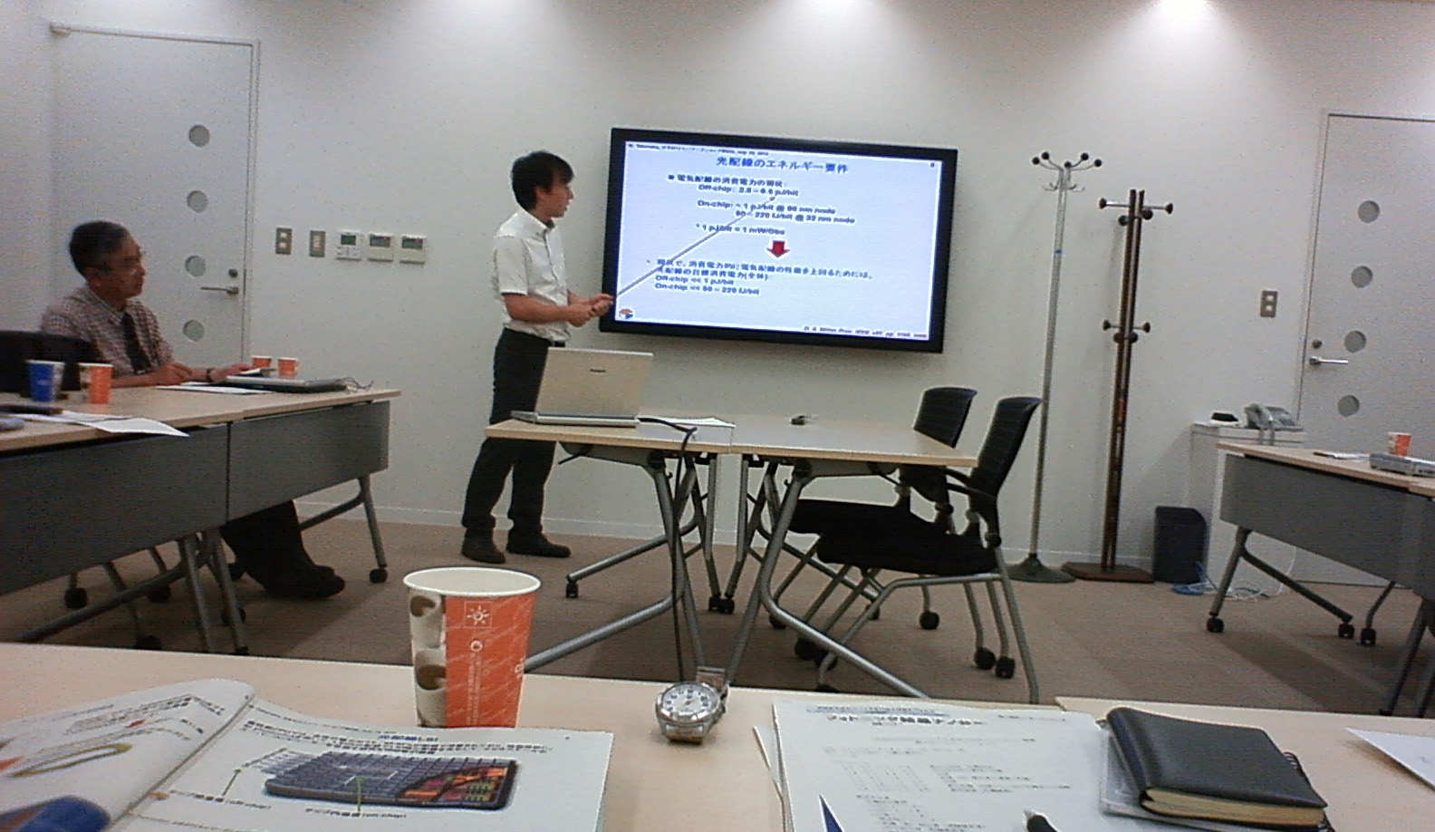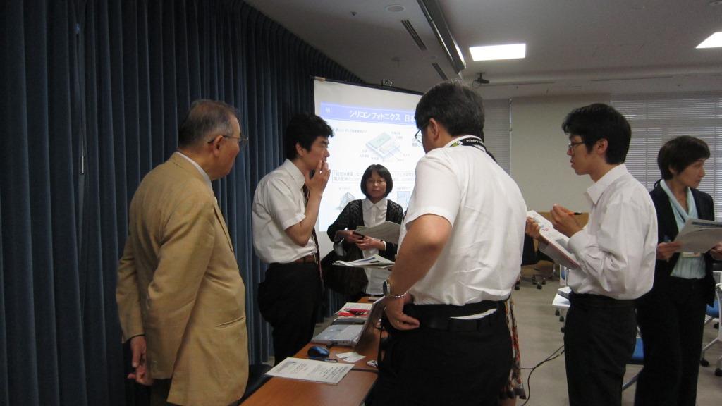 はじめに、竹中研究者から「光配線LSI実現に向けたSi photonicsの現状」というtutorialな話があった。現在の金属配線は電力消費による限界を迎えつつある。2006年Luxtera社は、Si光素子と周辺電子回路をモノリシック集積したチップを発表、Siフォトニクスが一気に加速した。その後IBMが光配線LSIのコンセプトを発表。しかし、光配線が電気配線より有利になるためにはoffn chipで10-20fJ/bit, on chipで2-7 fJ/bit以下というシビアな低消費電力を実現しなけらばならない。各要素技術をみるとLDは現状では10fJ/bit以下のデバイスはない。光変調器も現状では10ft/bit達成可能なデバイスはない。 PDについてのみ、Ge-PDで1-10fJ/bit達成可能。LDについてフォトニック結晶などhi-Q胸式との組み合わせに期待。オールSiを脱却してIII-V/Si photonicsも視野に入れるべき。 次いで、高橋研究者から、「フォトニック結晶ナノ共振器シリコンラマンレーザーの開発」と題して、フォトニック結晶の原理、研究トレンド、2次元フォトニック結晶VICSEL、ナノ共振器と量子ドット、ナノ共振器と導波路の組み合わせなどによって機能性の向上が図られたことなどのイントロの後、高橋研究者が取り組んできたシリコンラマンレーザについて、インテルの先行研究と比較しながら、彼の研究の背景と研究計画および現在までの経緯について述べた。現在ラマンレーザー発信直前まで到達しており、本来Siでは出ないはずのSHG発生の問題を見いだし、これを避けるために、パルス励起によるラマンレーザー発信を目指すことについて述べた。アドバイザ、研究者、JST関係者あわせ15名が参加、熱心にディスカッションがなされ、非常に実り多いワークショップであった。 |