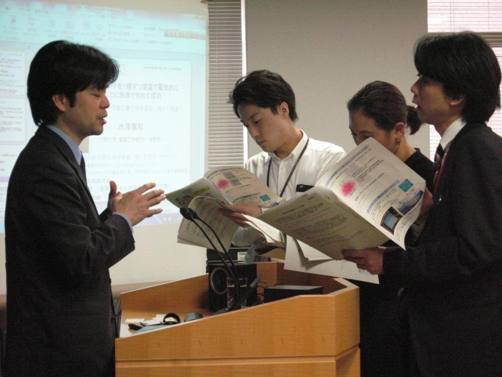 | 12.04.13 | 14:00 水落研究者とCREST産総研山崎研究者は「ダイヤモンドLEDで光子を1個ずつ室温発生させることに世界で初めて成功~盗聴不可能な量子暗号通信への応用に道~」という記者発表を行った。