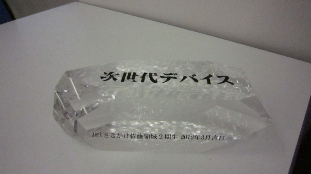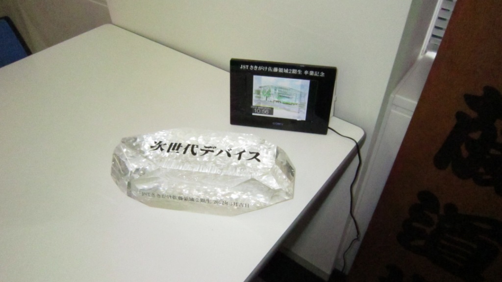 | 12.03.29 | 第2期卒業生から水晶の巨大結晶を頂いた。3/15にいただいたデジタルフォトフレームと一緒に領域事務所に飾った。 |