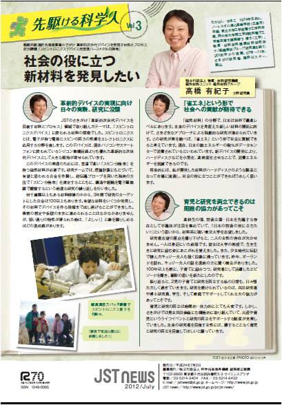 | 12.07.02 | 1期生の高橋有紀子研究者が、 JST News 7月号の裏表紙の「先駆ける科学人」コーナーで「社会の役に立つ新材料を発見したい」として紹介されました。 |