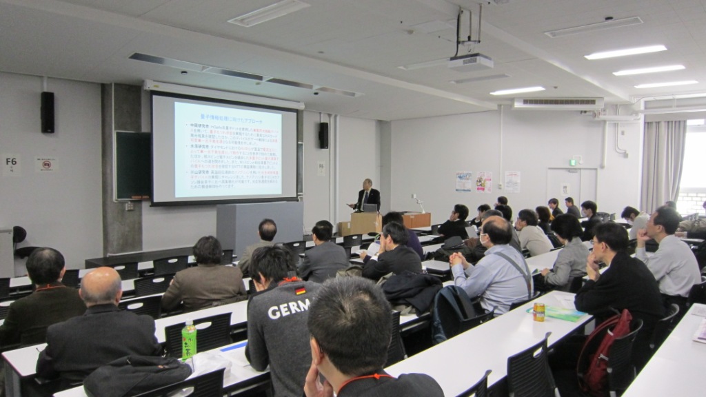 中岡研究者は、量子ビット(qubit)の考え方についてチュ?ートリアルな話をした後、研究中の半導体量子ドットの縦型発?光デバイスが重要であることを述べました。 水落研究者は、ダイヤモンドNV中心を用いた単一量子ド?ットの電流注入発光をみいだしたこと、量子もつれ状態の?4つの「ベル状態」を観測することに成功したこと、NT?Tと共同で行った超伝導量子ビットとの結合について述べまし?た。 |