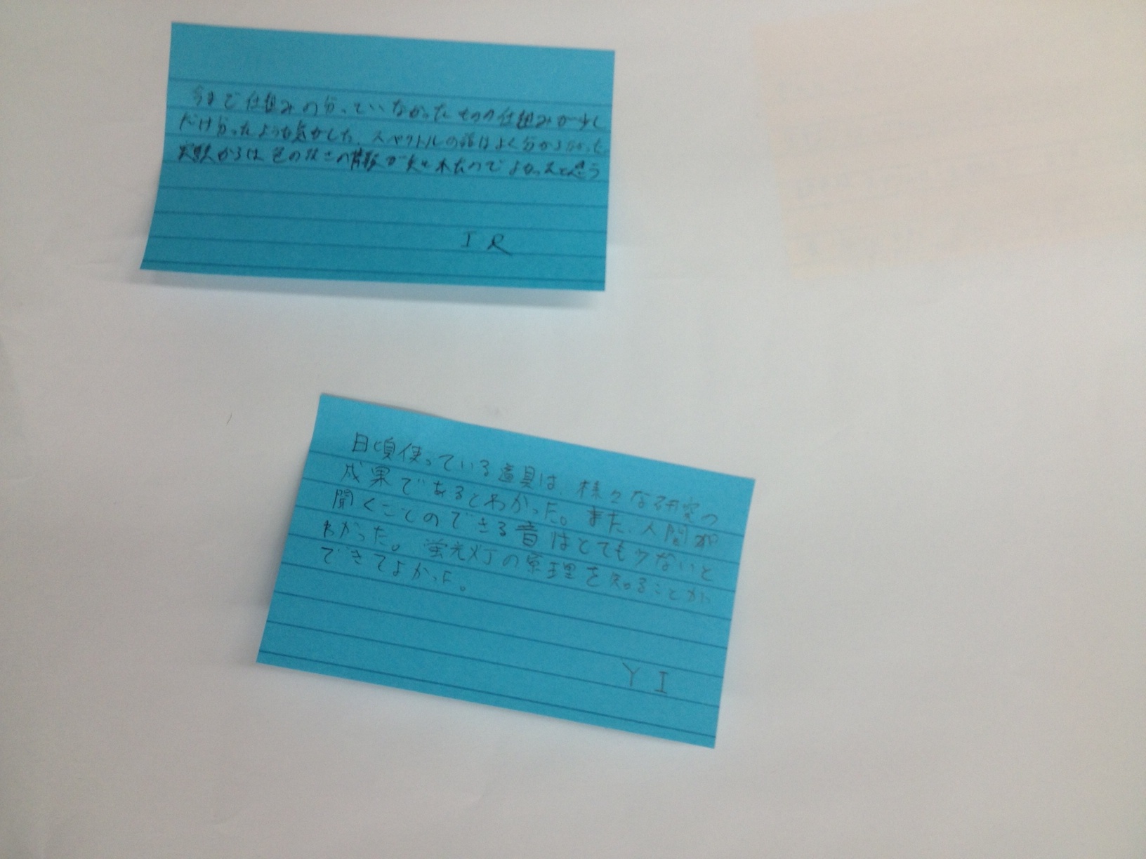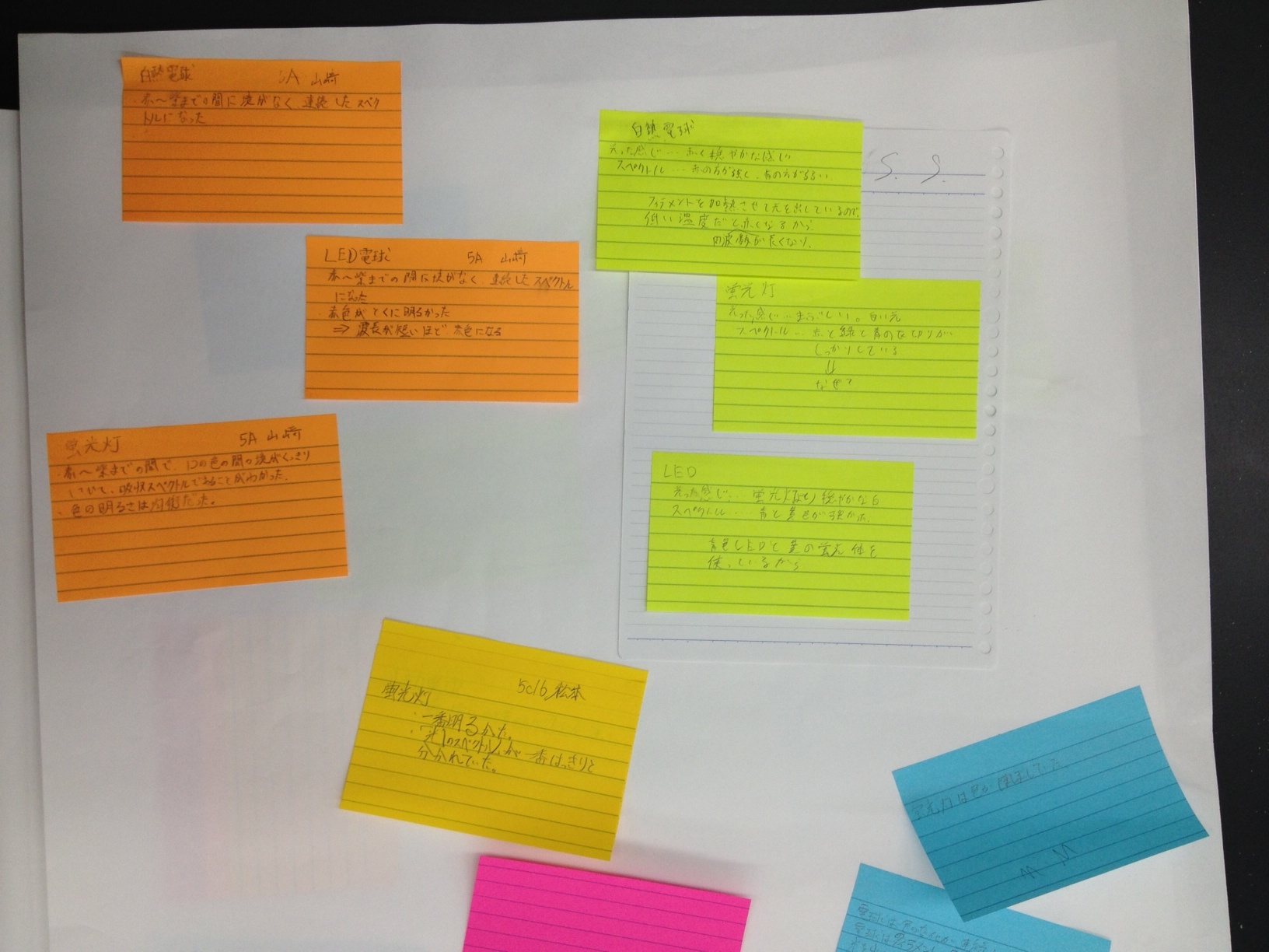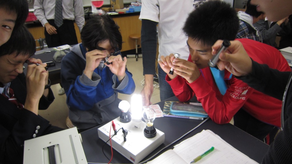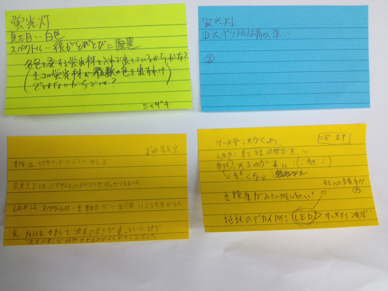 - 白熱電球、蛍光灯、白色LEDの内部の理論について100%理解できたなどと虚勢を張るつもりはない。しかし、多少の理解と、スペクトルを利用した「自分で考えて発見をまとめていく実験」などにより、それらの発する光の違いを自分なりに納得し解釈するまでに至ったとは思う。そのぼんやりとまとまった解釈を班内で意見を交わして発表までしたことも、より深く考える上で刺激になると同時に、非常に助けになった。(中略)最後になってしまいましたが、このようなまだ数多くが中途半端な状態にある自分たちのためにわざわざ講義をしていただき、本当にありがとうございました。