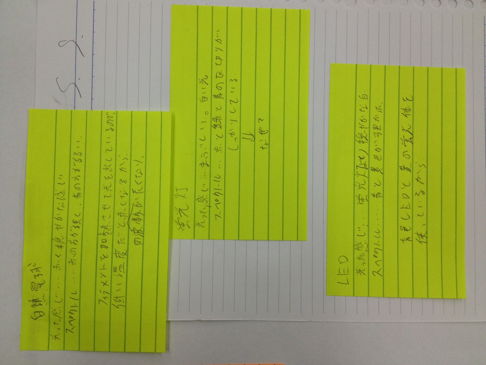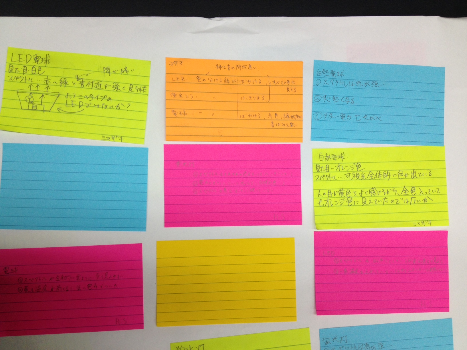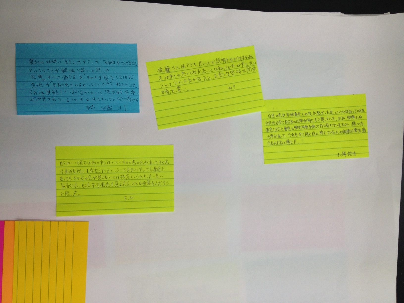 - 白熱電球、蛍光灯、白色LEDの内部の理論について100%理解できたなどと虚勢を張るつもりはない。しかし、多少の理解と、スペクトルを利用した「自分で考えて発見をまとめていく実験」などにより、それらの発する光の違いを自分なりに納得し解釈するまでに至ったとは思う。そのぼんやりとまとまった解釈を班内で意見を交わして発表までしたことも、より深く考える上で刺激になると同時に、非常に助けになった。(中略)最後になってしまいましたが、このようなまだ数多くが中途半端な状態にある自分たちのためにわざわざ講義をしていただき、本当にありがとうございました。