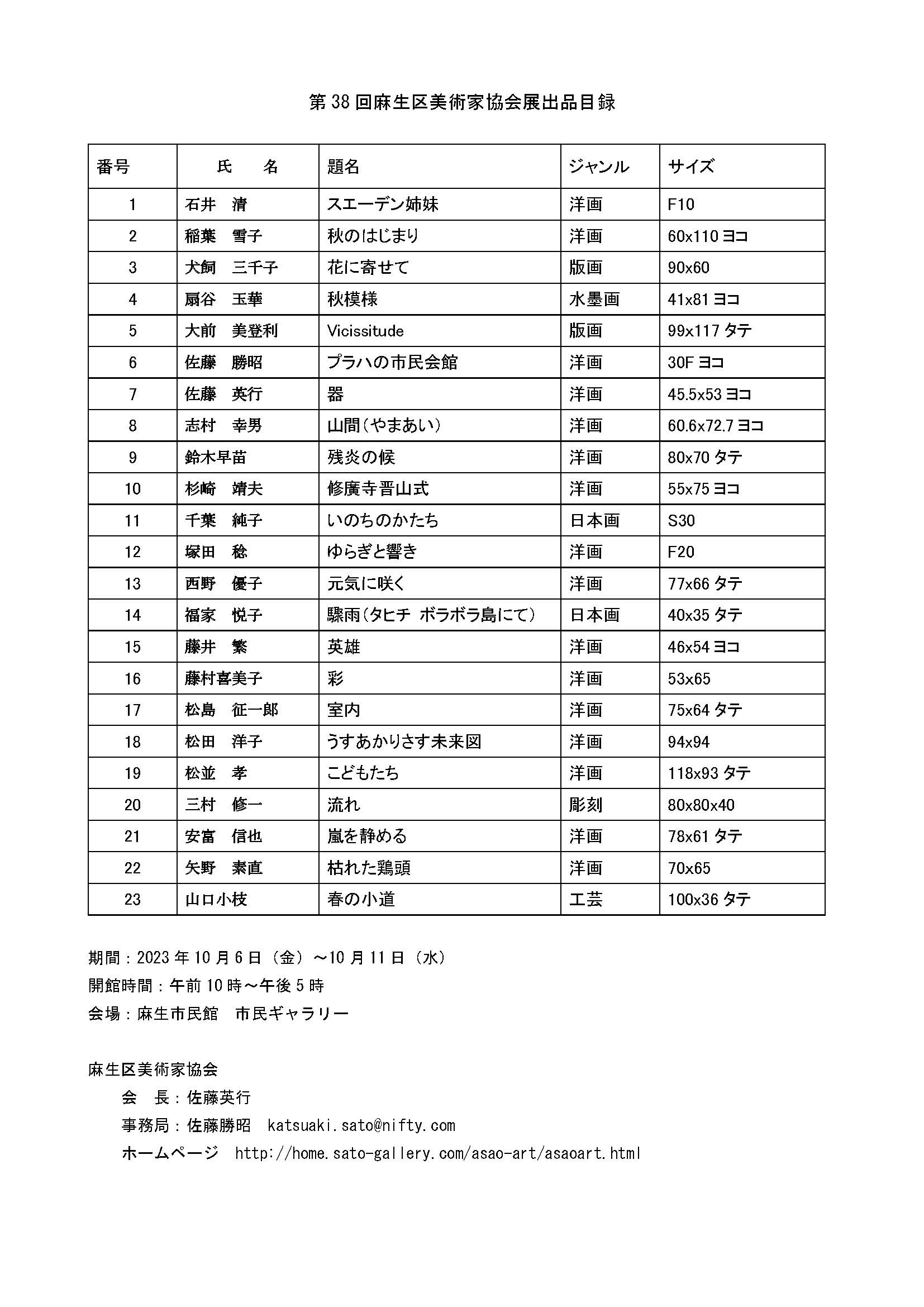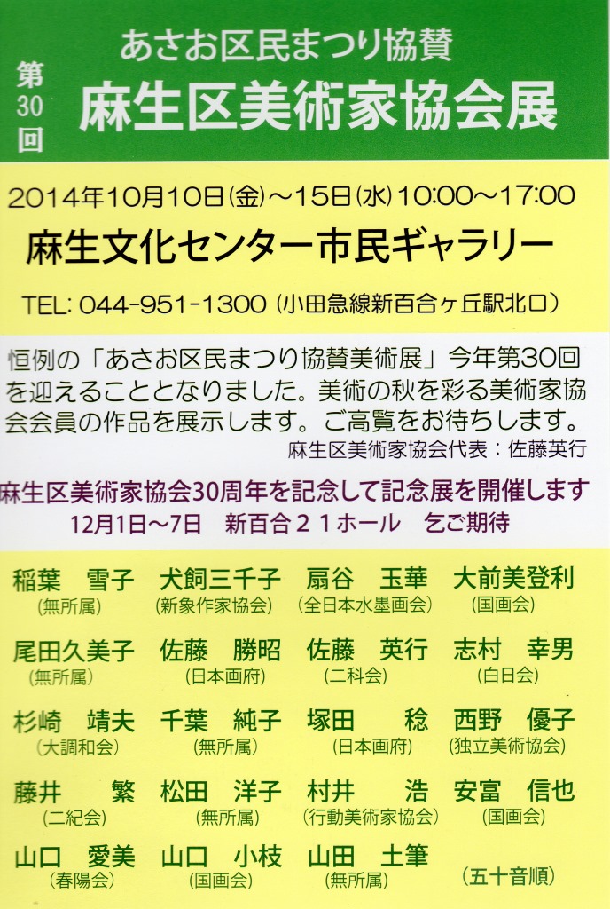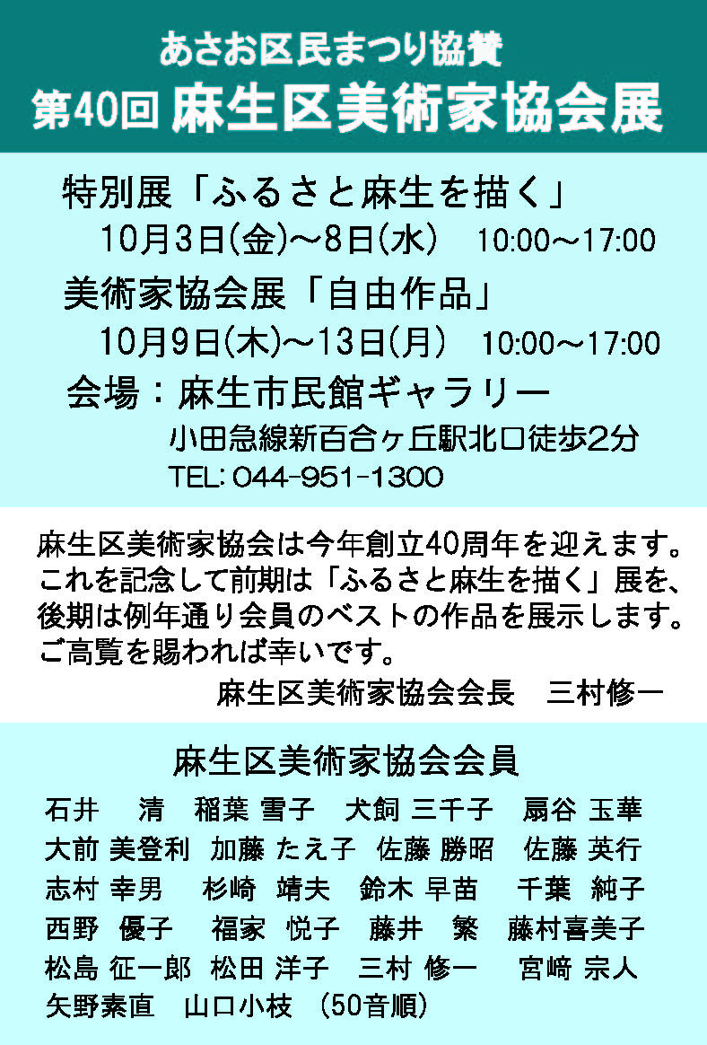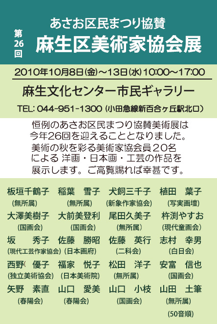 | 2010.05.30 | 予告今年の秋のあさお区民まつり協賛「麻生区美術家協会展」は2010.10.8(金)~10.13(火)に行われます。 | 麻生市民館市民ギャラリー | 搬入飾り付けは10月7日午後3時, 搬出は10月13日午後5時 |
