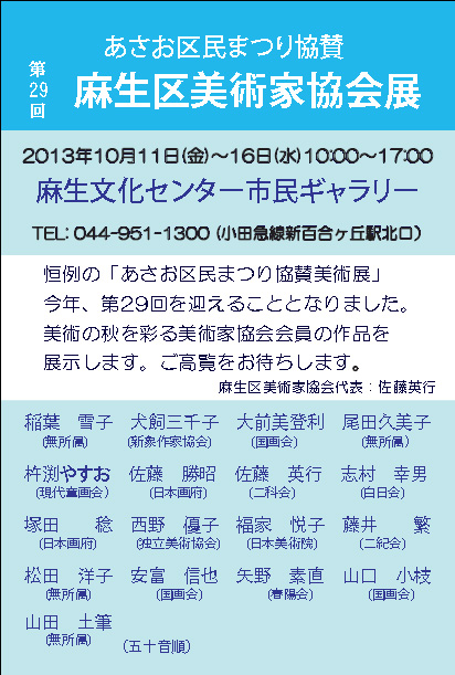 | 2013.10.11-16 | 第29回麻生区美術家協会展 | 麻生市民館ギャラリー | ![]() |
