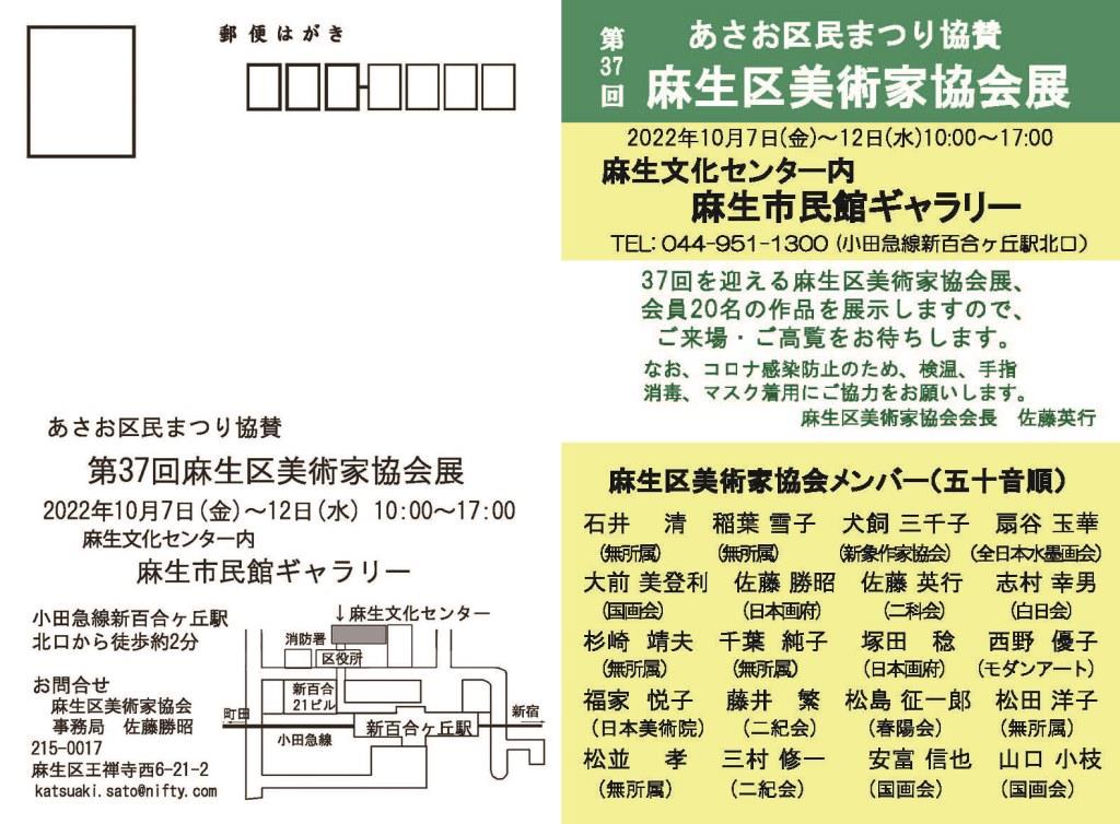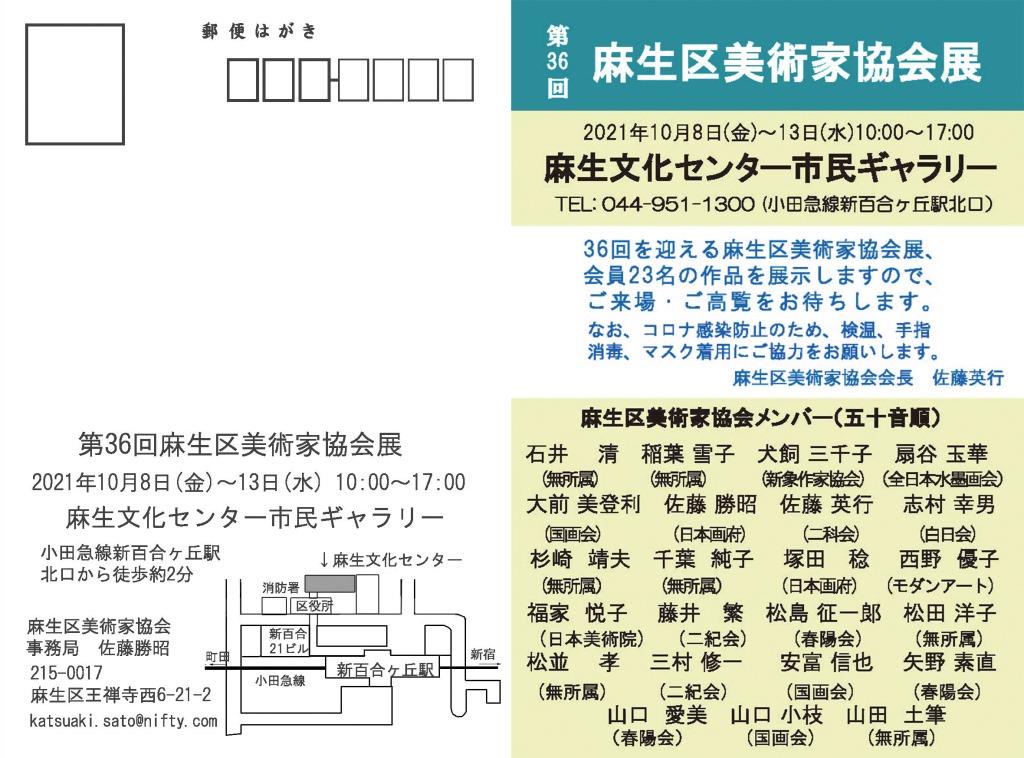 | 2021.09.12 | 第36回麻生区美術家協会展(2021.10.8(金)~10.13(水))の案内状ができました。 | 麻生市民館市民ギャラリー | ![]() |