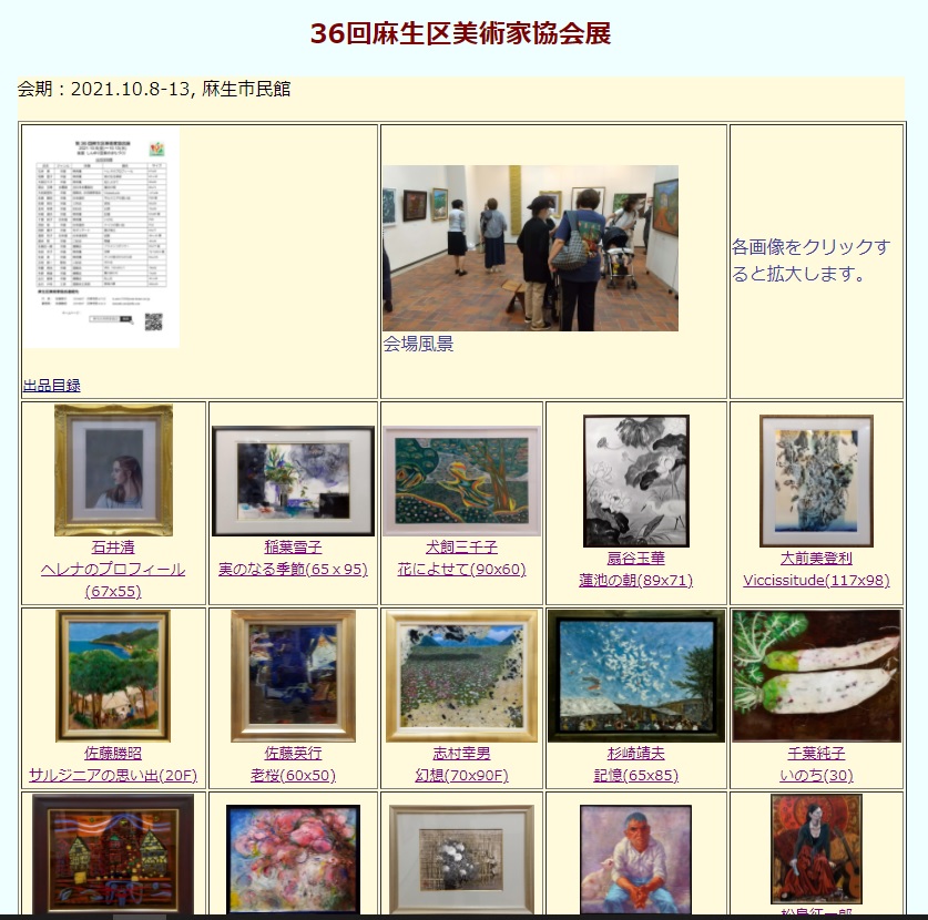 | 2021.10.8-13 | 第36回麻生区美術家協会展が開催され6日間で706名のお客様がありました。 | 麻生市民館市民ギャラリー | 第36回麻生区美術家協会展作品展示 |