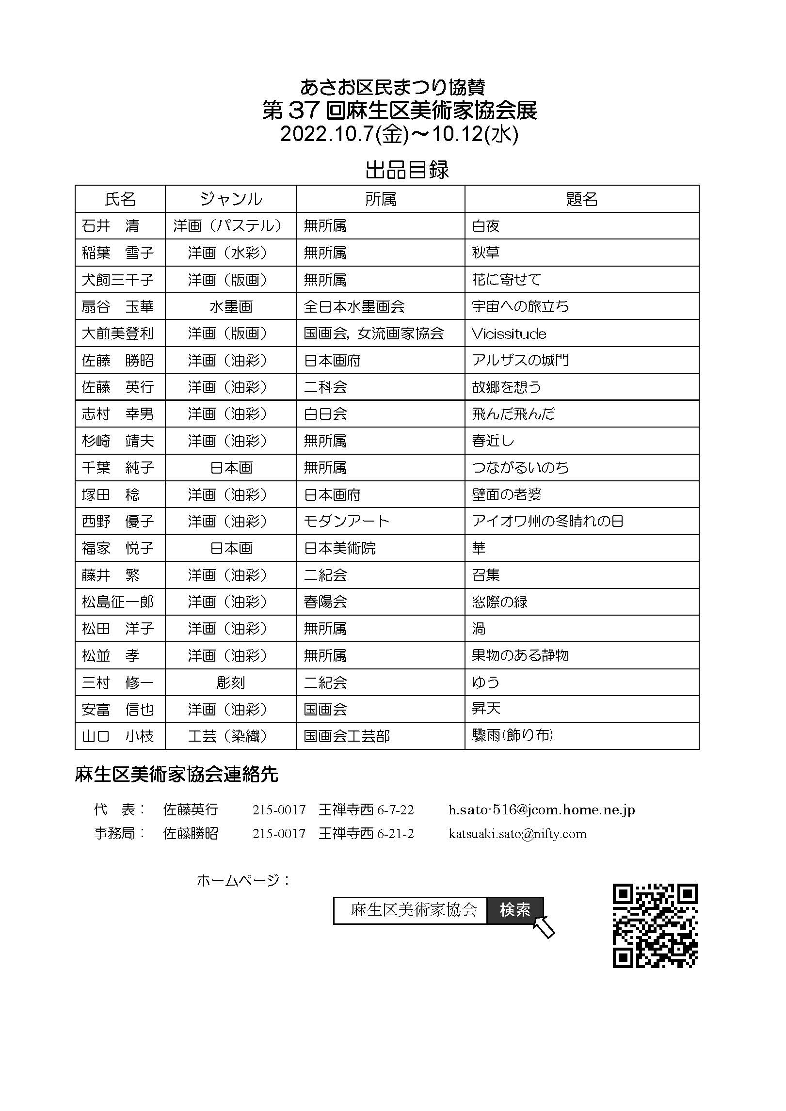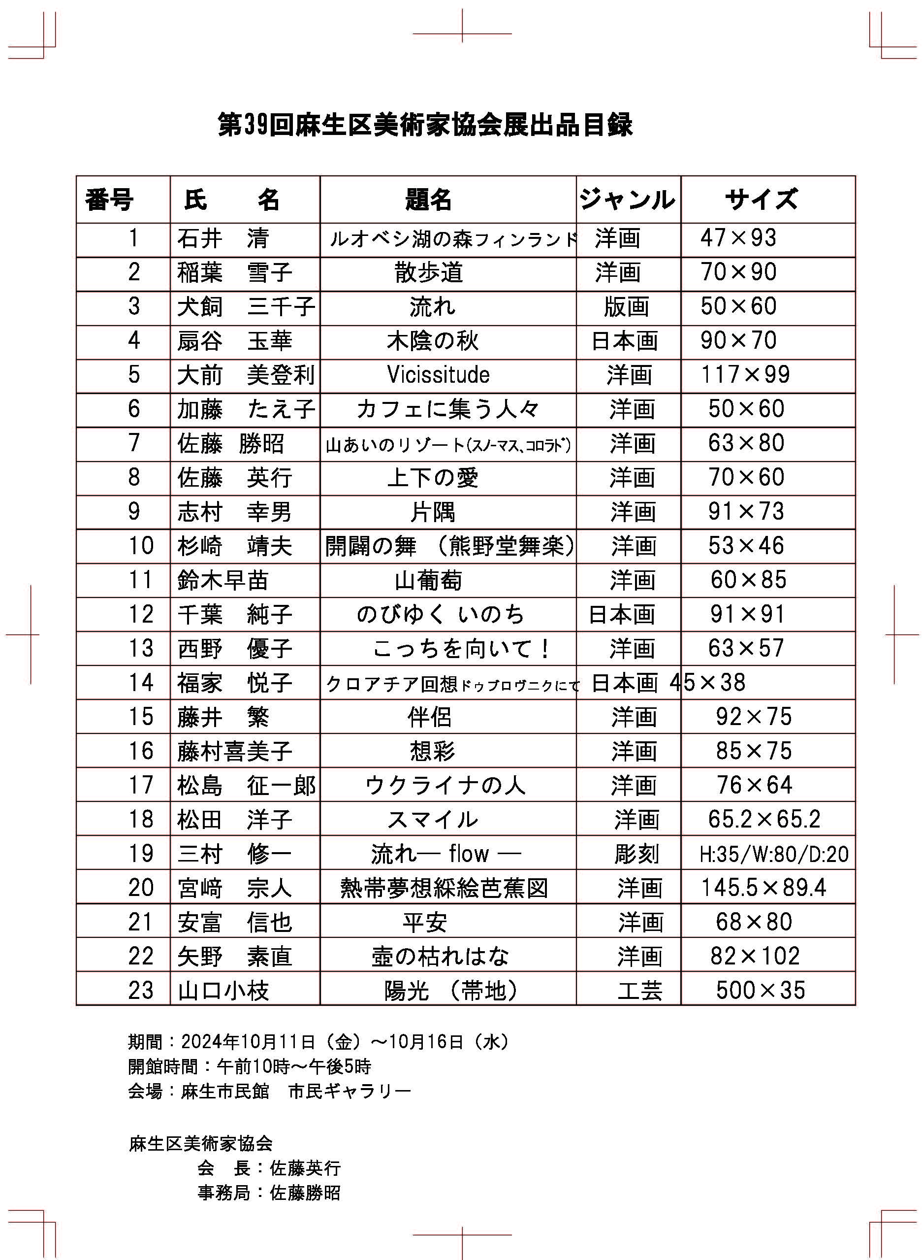 前会長佐藤英行さんはじめ今まで役員を務めていただいた方、長い間、麻生区美術家協会を支えていただきありがとうございました。前会長さんのようにはできませんが、皆様の力を借りて会長の仕事を進めたいと思います。自分の住む麻生の地で、作品を見てもらえる喜びを 実感できる作品展を目指します。 会員の皆様と一緒に、作品発表を通して表現することを楽しんで行きたいと思います。 | ||