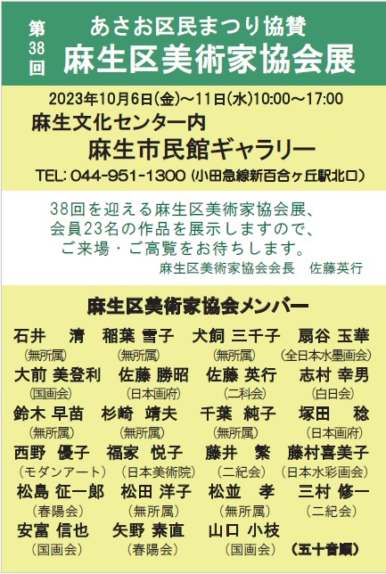 | 2023.10.06~10.11 | 第38回麻生区美術家協会展を開催しました。 | 麻生市民館市民ギャラリー | ![]() |