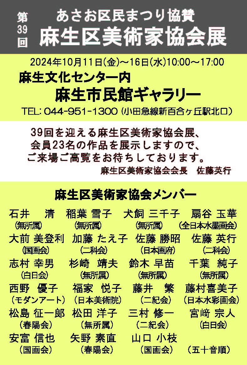 | 2024.10.11~10.16 | 第39回麻生区美術家協会展を開催しました。 | 麻生市民館市民ギャラリー | ![]() |