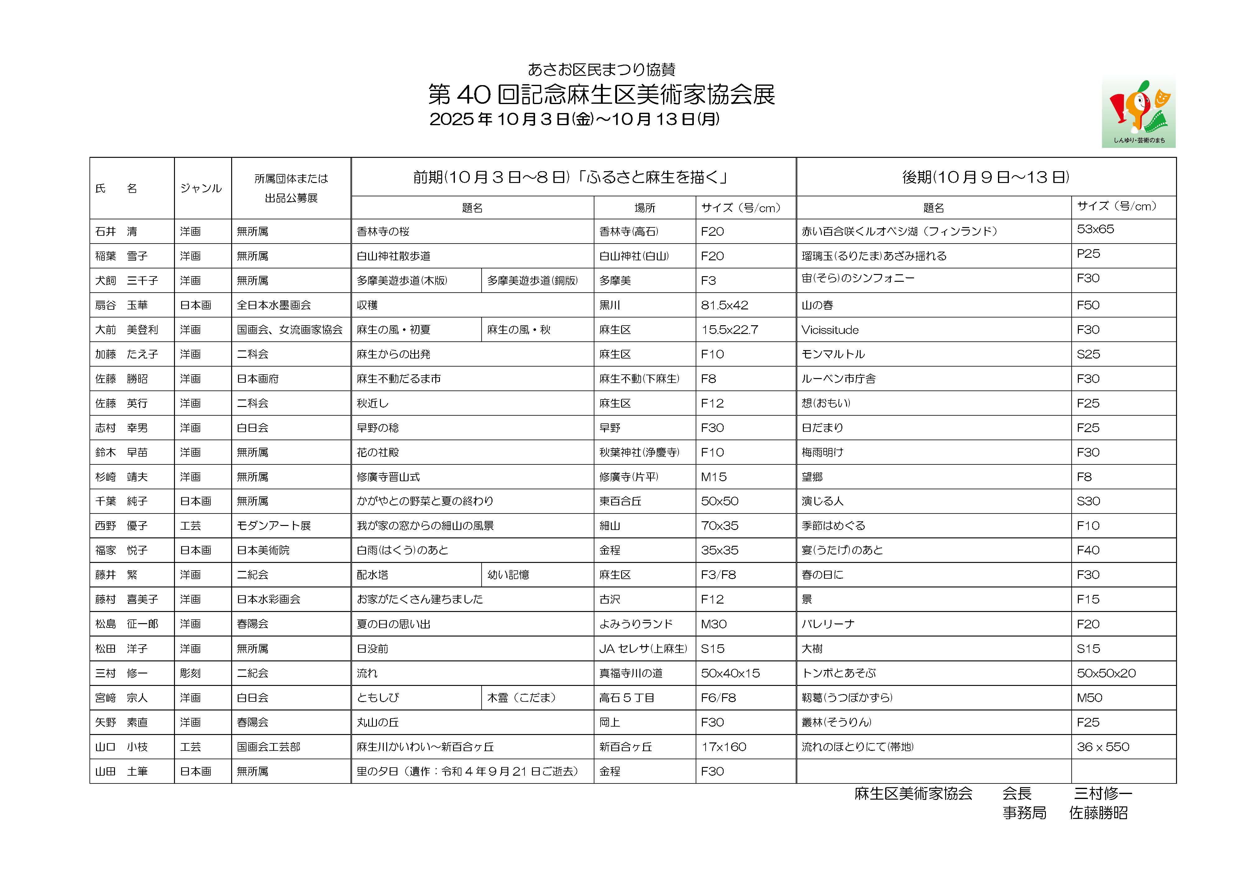 | 2025.10.03~10.13 | 第40回麻生区美術家協会展を開催しました。 | 麻生市民館市民ギャラリー | 期間中、前期(3日~8日)は、40周年記念展として、「ふるさと麻生を描く」をテーマに麻生区に関わる作品を展示、後期(9日~13日)には、麻生区民まつり協賛美術展として、従来通り各自の自由なテーマで作品を展示しました。前期には827名、後期には796名、計1623名のご来場者があり、成功裏に終了ました。ご支援に感謝します。 |