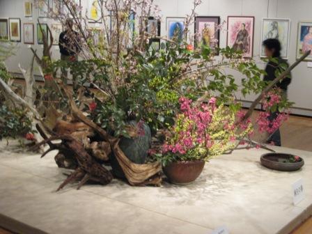 部屋の中央に麻生生け花協会16名の共同作業で生け花作品「麻生の春」を展示します。