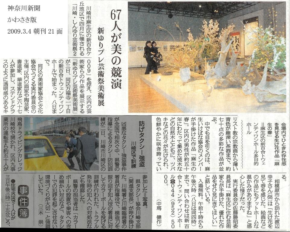 川崎・しんゆり芸術祭2009のプレイベントとして開催した新ゆりプレ芸術祭美術展は、1600名を超える参観者を得て成功裏に終了しました。