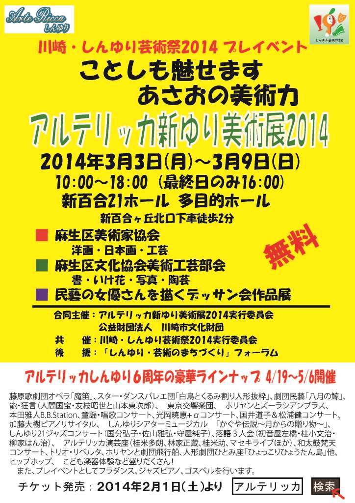 | 2009年3月の新ゆりプレ芸術祭美術展, 2010年3月のアルテリッカ新ゆり美術展2010, 2011年3月のアルテリッカ新ゆり美術展2011, 2012年4月のアルテリッカ新ゆり美術展2012, 2013年3月のアルテリッカ新ゆり美術展2013の成功を受けて、「アルテリッカ新ゆり美術展2014」を開催しました。期間中1501名の参観者で賑わいました。 | ||