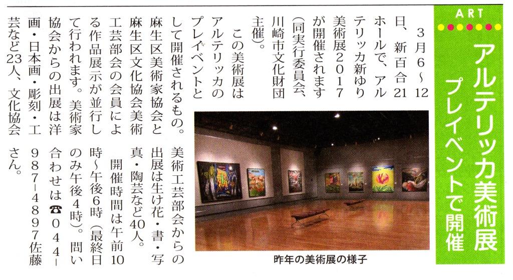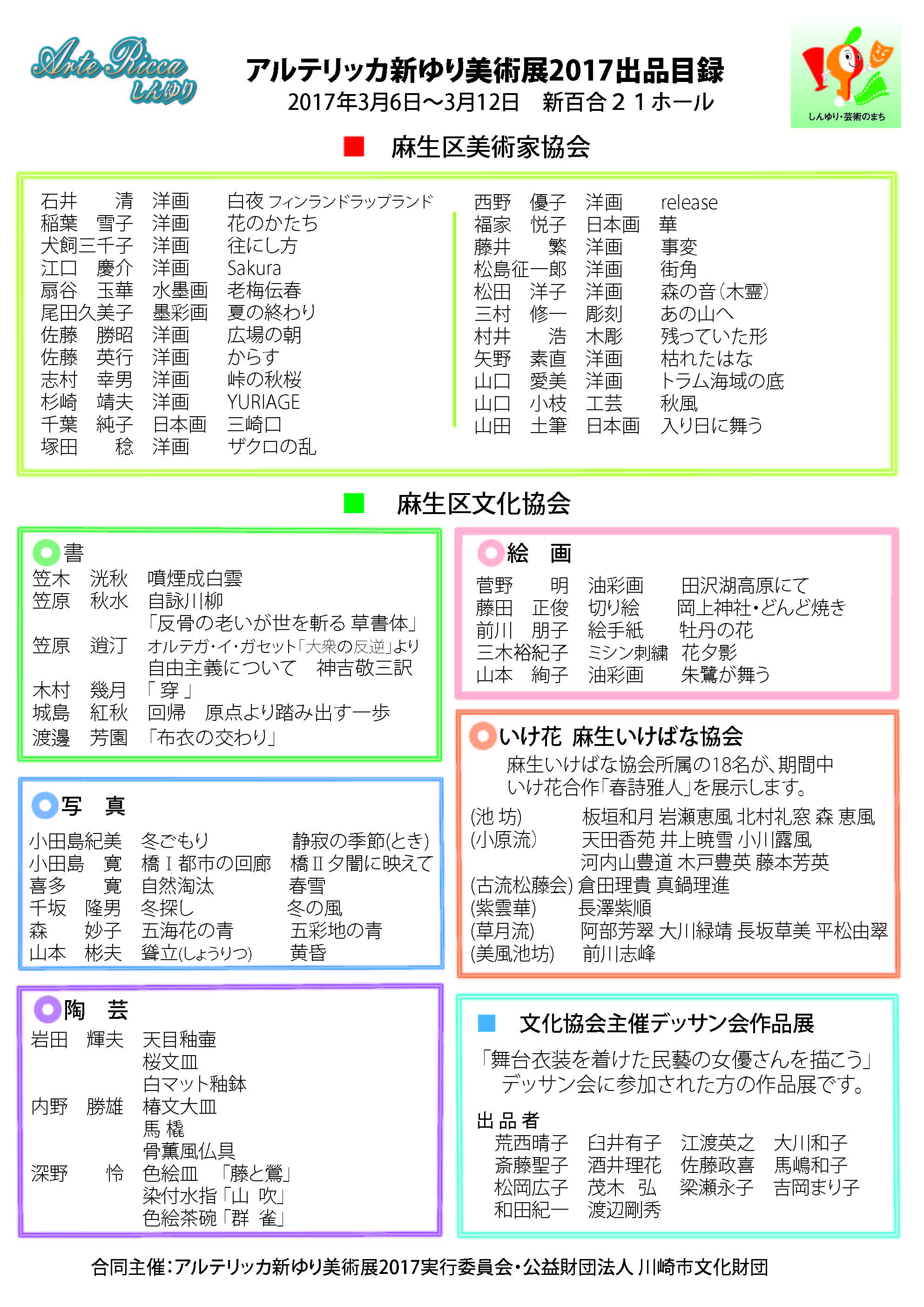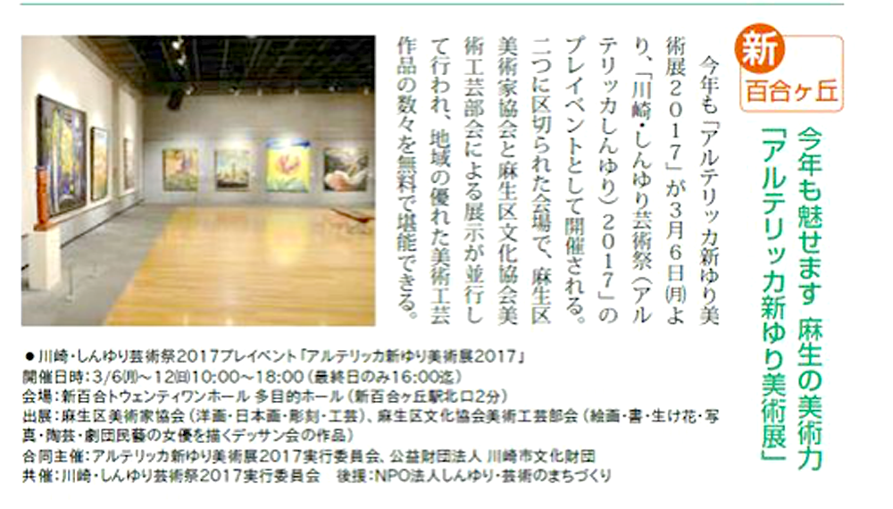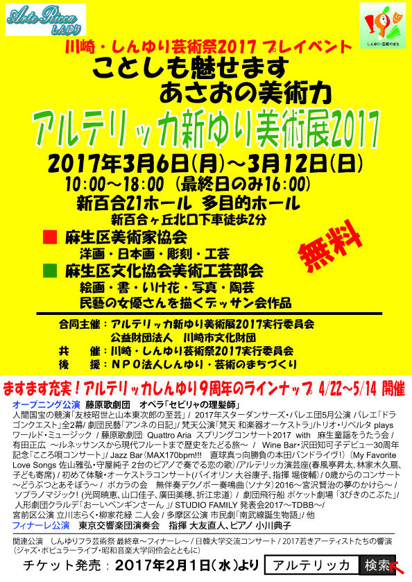 | 新ゆりプレ芸術祭美術展(2009.3), アルテリッカ新ゆり美術展2010(2010.3), アルテリッカ新ゆり美術展2011(2011.3), アルテリッカ新ゆり美術展2012(2012.4), アルテリッカ新ゆり美術展2013(2013.3), アルテリッカ新ゆり美術展2014(2014.3), アルテリッカ新ゆり美術展2015(2015.3), アルテリッカ新ゆり美術展2016(2016.3)を引き継いで、2017年3月に「アルテリッカ新ゆり美術展2017」が開催されました。 | ||