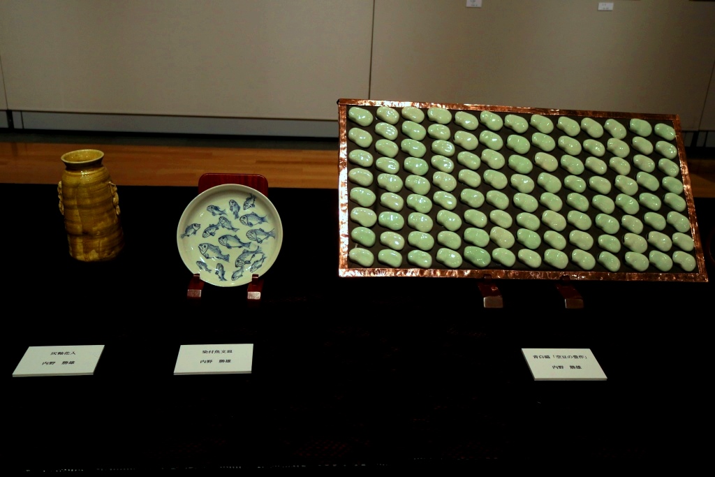 | 内野 勝雄 | 青白磁「空豆の豊作」・灰釉花入・染付魚大皿 | |||