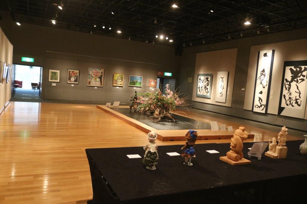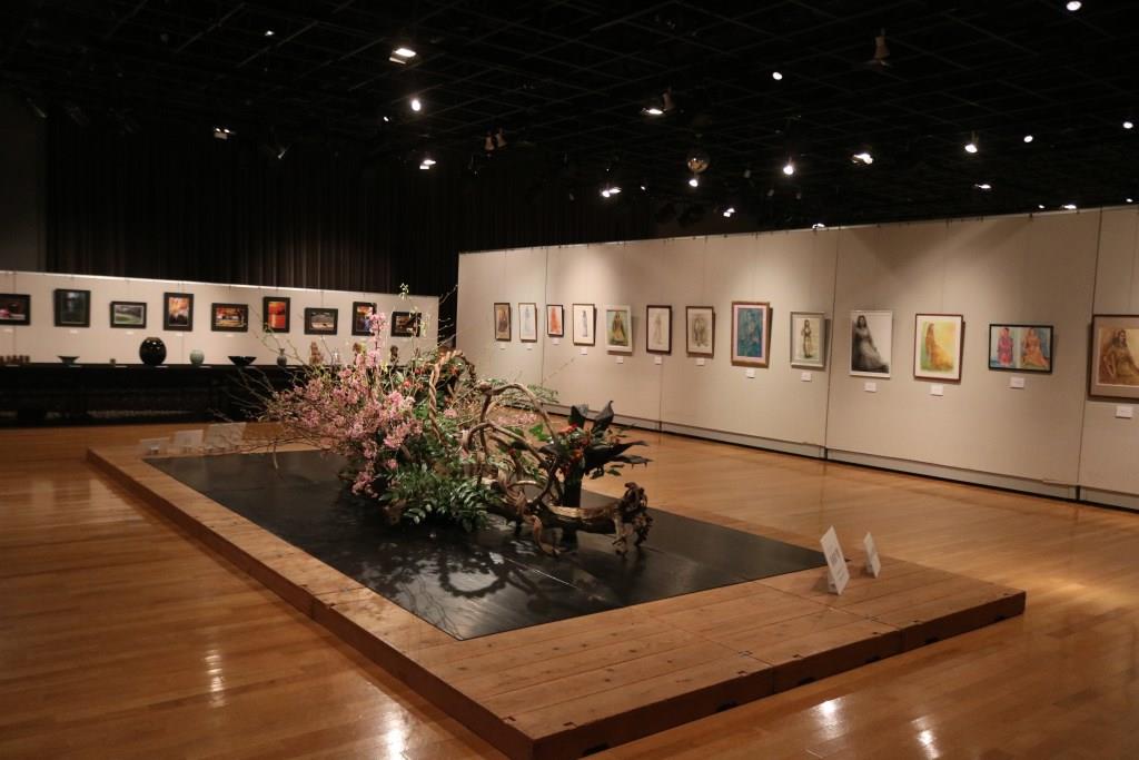 | 本事業においては、会場を半分にわけ、麻生区美術家協会の作品展示と、麻生区文化協会美術工芸部会の作品展示の2つを平行して行いました。 美術家協会は、洋画・日本画・彫刻・工芸の大作をを展示しました。文化協会は、麻生区いけばな協会会員のいけ花展示、絵画、書、写真、工芸、彫刻の展示に加え、文化協会主催の「民藝の女優さんを描くデッサン会」参加者の作品を展示しました。 | ||||