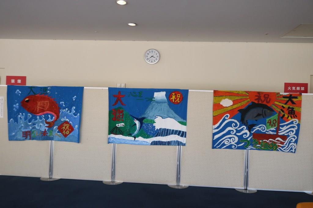 | 「川崎ジュニア文化賞」受賞作品をホワイエで展示しました。 | 栗木台小学校40周年記念大漁旗をホワイエで展示しました。 | |||