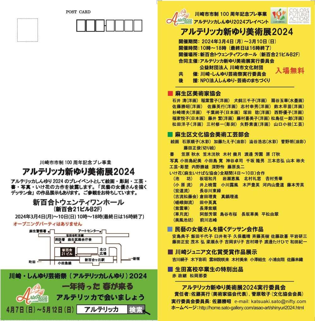 ![]() ちらし(A4) | ![]() DMはがき | ![]() アルテリッカ2024年HP | 川崎市市制100周年記念事業公式WEBサイト | |