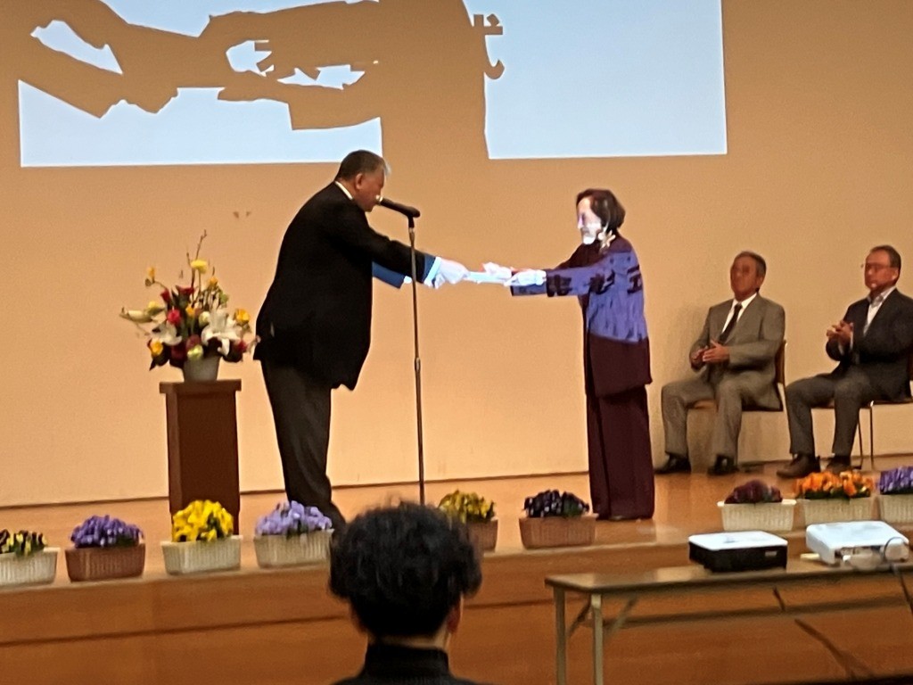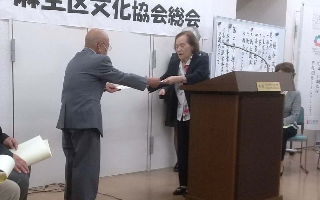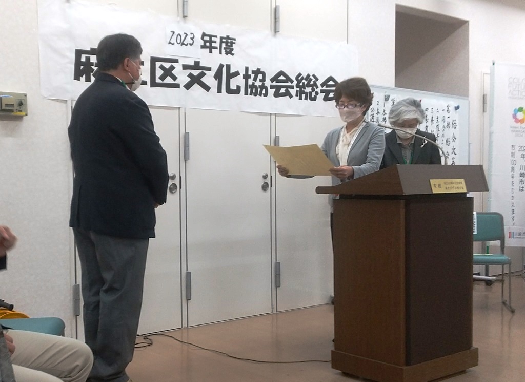 | 2024.04.21 | 2024年度総会が開催されました。菅原会長の挨拶に引き続き表彰式があり、木村幾子様・芳賀優子様に川崎市文化祭奨励賞が岸麻生区副区長から授与され、伊藤胡桃様・関森田鶴子様・横須賀朝子様に麻生区文化振興賞が菅原会長より授与されました。来賓挨拶のあと、議事に移り、 佐藤百合子議長のもと2023年度事業報告, 2023年度決算書、2023年度特別会計報告書および監査報告書が報告され拍手で承認、ついで2024年度事業計画、2024年度予算が審議され拍手で承認されました。このあと、役員選考委員会を代表して丸山博子委員長が2024-2025年度新役員を発表しました。新会長の板橋洋一が挨拶、今回で役員を辞める前会長菅原様、前副会長山室様、前総務橋本様に花束の贈呈がありました。 |