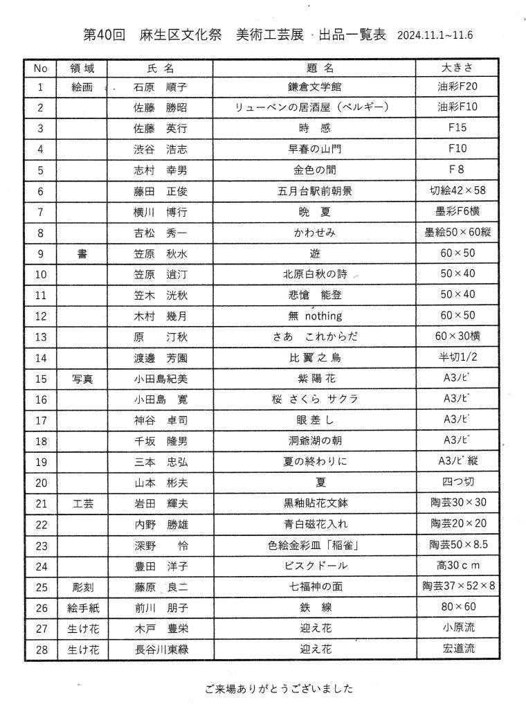 | 2024.11.1-11.6 (11.5休館) | 第40回麻生区文化祭美術工芸展開催。 | | |||