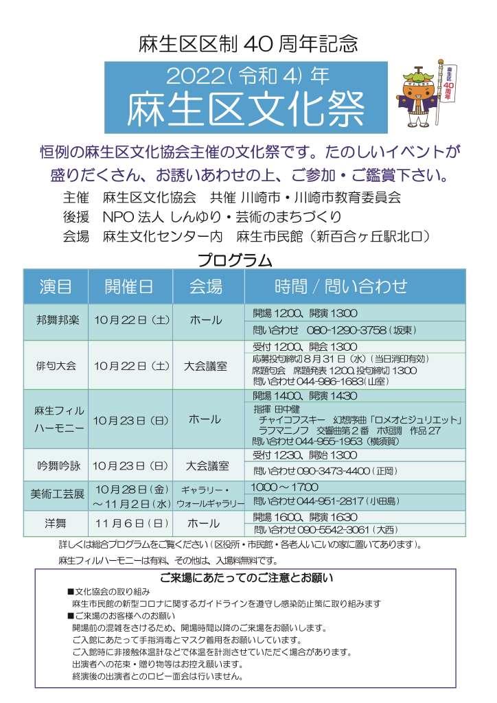 | 2022.8.5 | 麻生区文化祭チラシができました。 | ![]() 文化祭チラシ | |||
