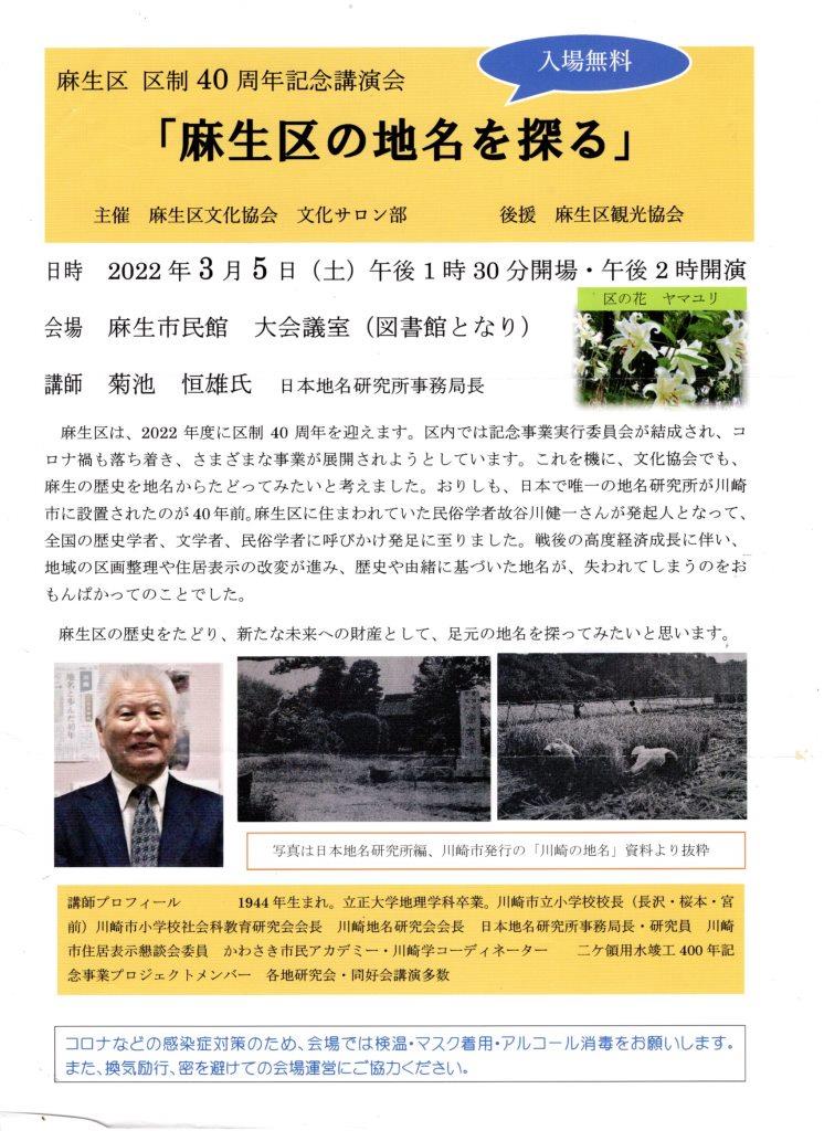 | 2022.03.05 | 日本地名研究所 菊地恒雄氏を講師にお招きして麻生区区制40周年記念講演会「麻生区の地名を探る」を市民館大会議室で開催、開催、聴講者は160名でした。 | ![]() | |||