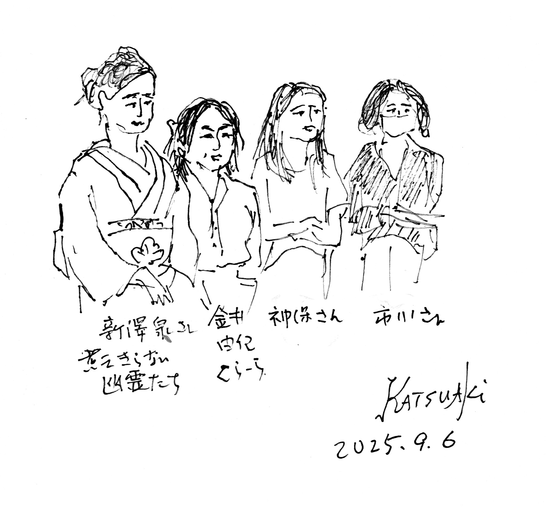 | 2025.09.06 | 「舞台衣装の女優さんを描こう」デッサン会を開催しました。 モデル:劇団「民藝」所属の女優さん2名(新澤泉さん、金井由妃さん) 会場:麻生市民館大会議室 13:00開場、16:00終了 終了後、女優さんと民藝の神保さん、市川さんを交えて懇談しました。 |