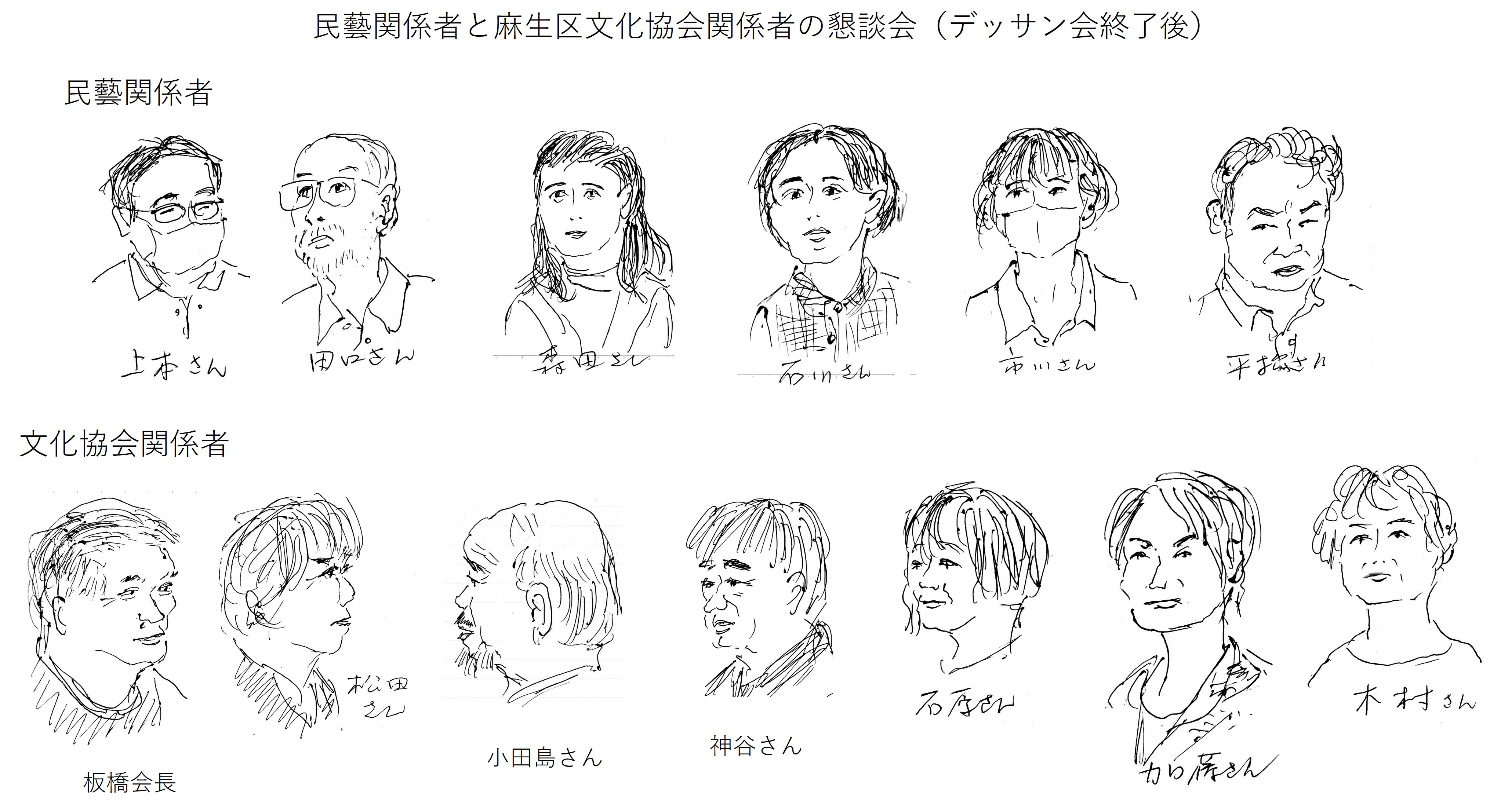 | 2024.06.15 | 「舞台衣装の女優さんを描こう」デッサン会を開催しました。 モデル:劇団「民藝」所属の女優さん2名(森田咲子さん、石川桃さん) 会場:麻生市民館大会議室 13:00開場、16:00終了 終了後、女優さんと民藝の田口さん、平松さん、上本さん、市川さんを交えて懇談しました。 |