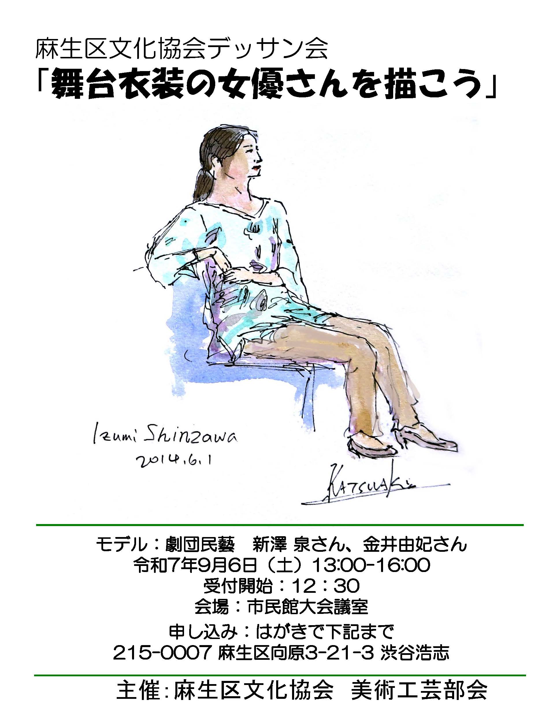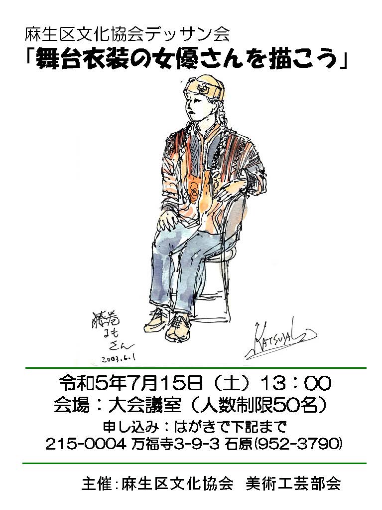 | 2023.05.11 | 麻生区文化協会が7/15に大会議室で開催する「舞台衣裳の女優さんを描くデッサン会」の参加者公募を開始しました。 参加費:麻生区文化協会会員・民藝絵画部員1,000円、その他2,000円 申込はハガキで。 | ![]() デッサン会参加者公募ポスター | |||