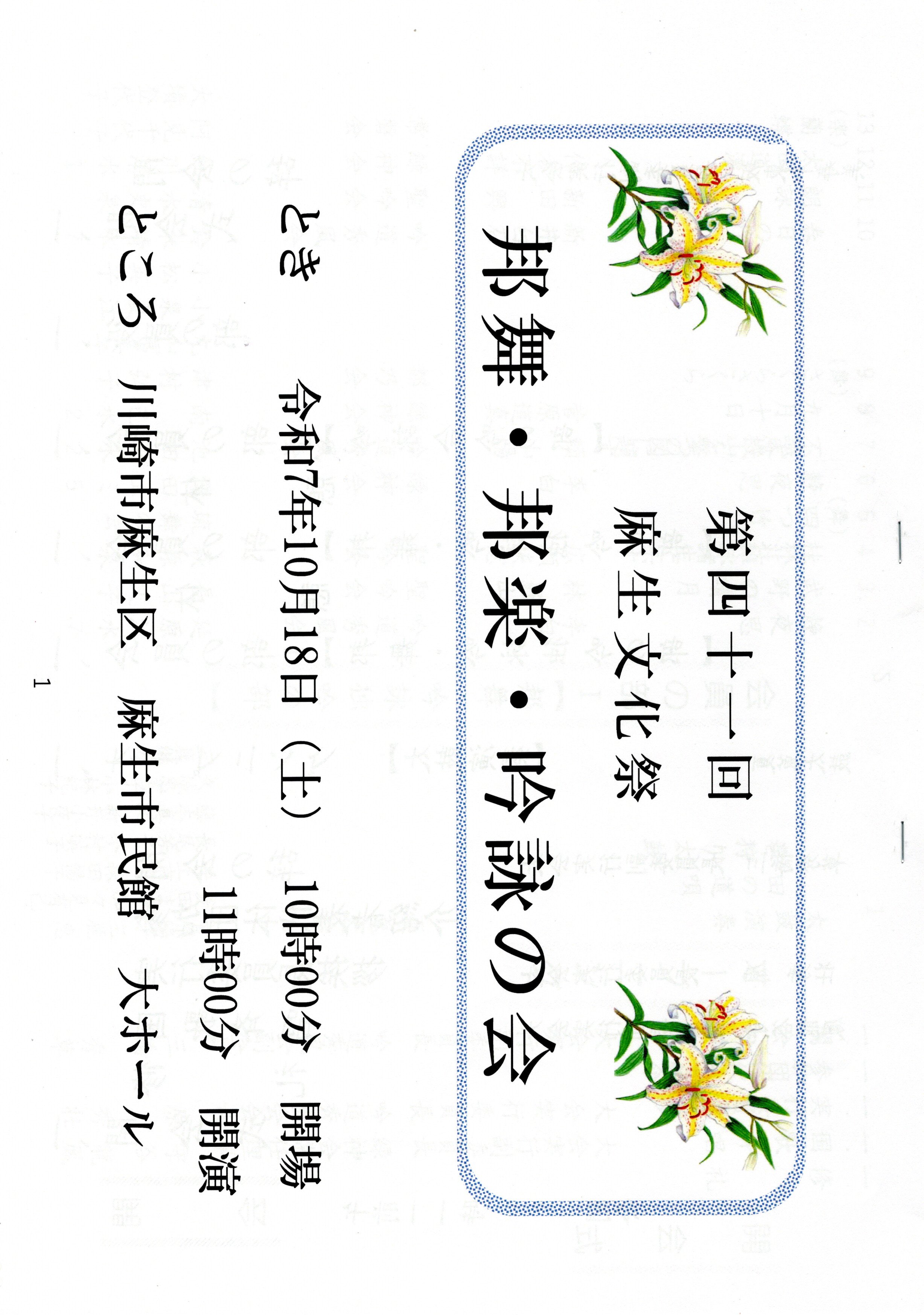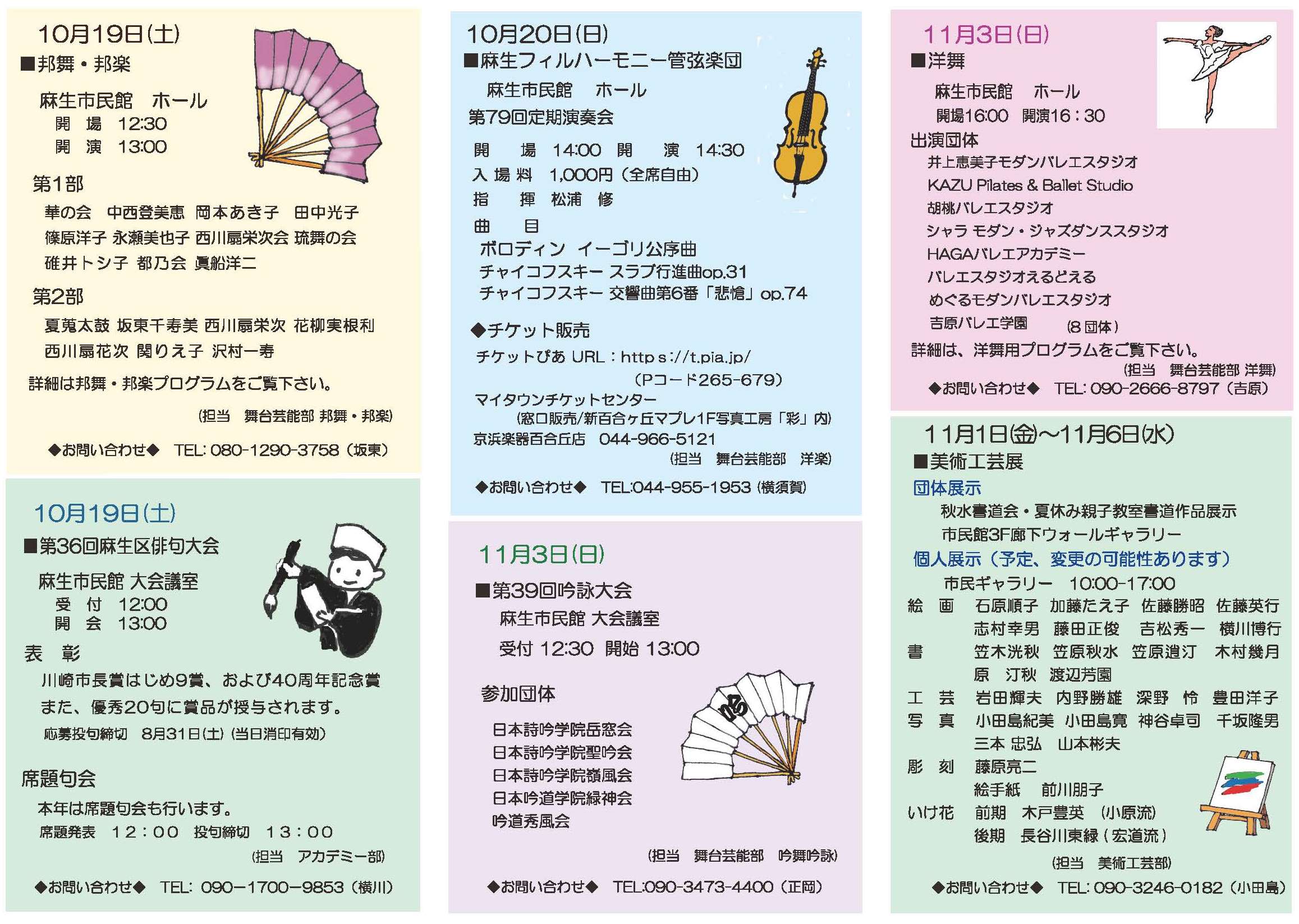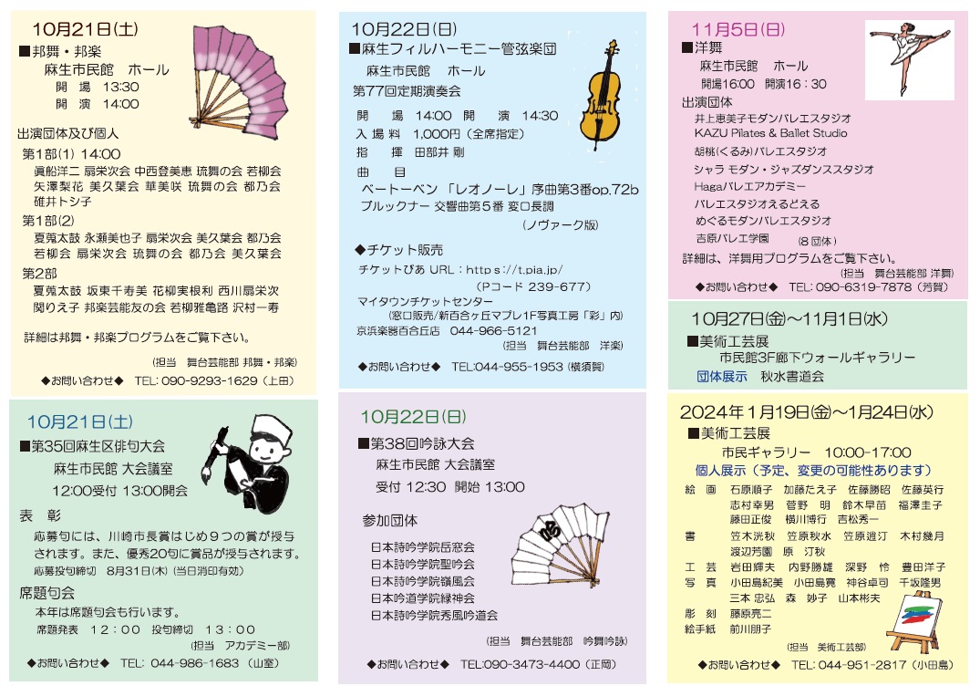 | 2024.10.19,20 | 第40回麻生区文化祭始まる 10/19 大会議室で「第36回俳句大会」、ホールで「邦舞・邦楽」公演がありました。 10/20 ホールで麻生フィルハーモニー管弦楽団の第79回定期演奏会がありました。 | ![]() 俳句大会句集 邦舞邦楽パンフ 麻生フィルパンフ | |||
