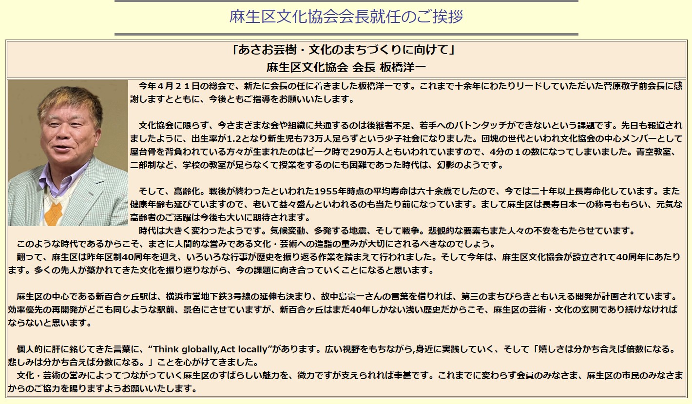 | 2024.06.19 | 板橋洋一会長の就任の挨拶をアップしました。 | ![]() | |||