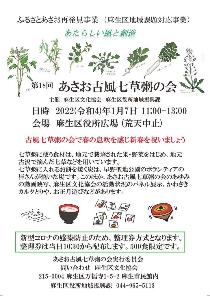 | 2022.12.14 | 麻生区役所地域振興課の職員に参加していただき、第19回あさお古風七草粥の会の実行委員会が開催されました。 会場での喫食800食、テイクアウト200食を提供すること、整理券を10:30から配布するすること、コロナ感染防止のため座席は机の片側のみとすること等が決まりました。 七草粥の会のチラシが配布されました。 | 七草粥の会チラシ | |||