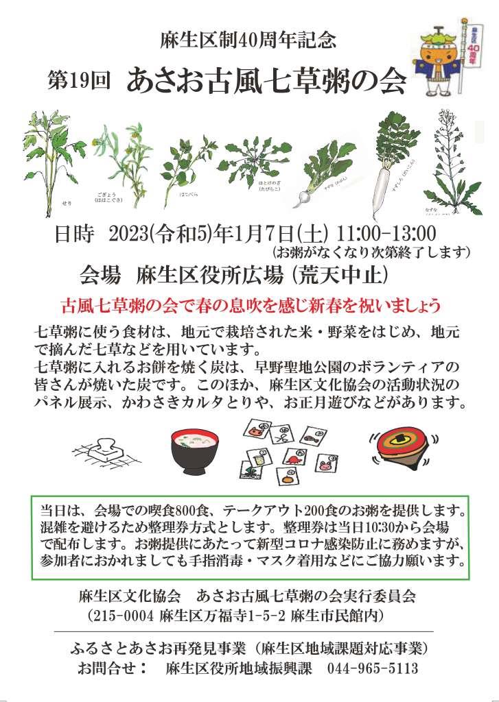 | 2023.01.07 | 晴天に恵まれ、「第19回あさお古風七草粥の会」が賑やかに開催されました。1000食(内100食はテイクアウト)を配布しました。子ども基金の募金が18000円あり、読売光と愛の事業団に寄贈しました。 |