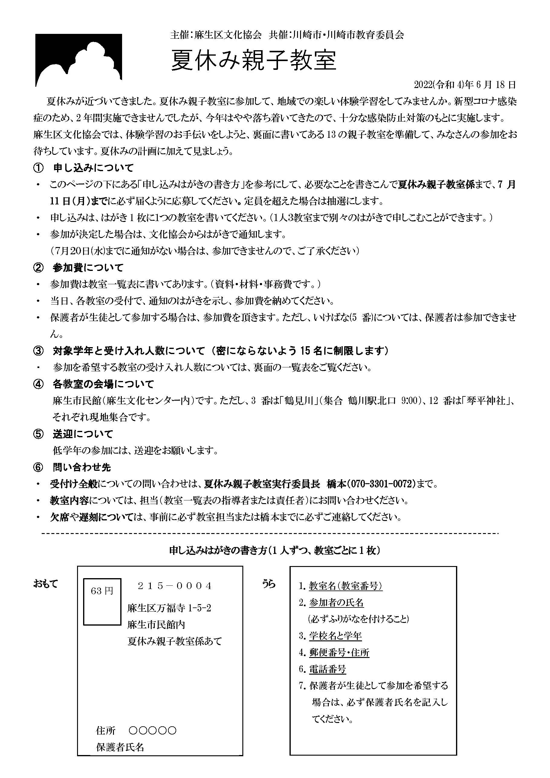 | 2022.06.20 | 3年ぶりに夏休み親子教室を開講します。13教室を予定しています。 |