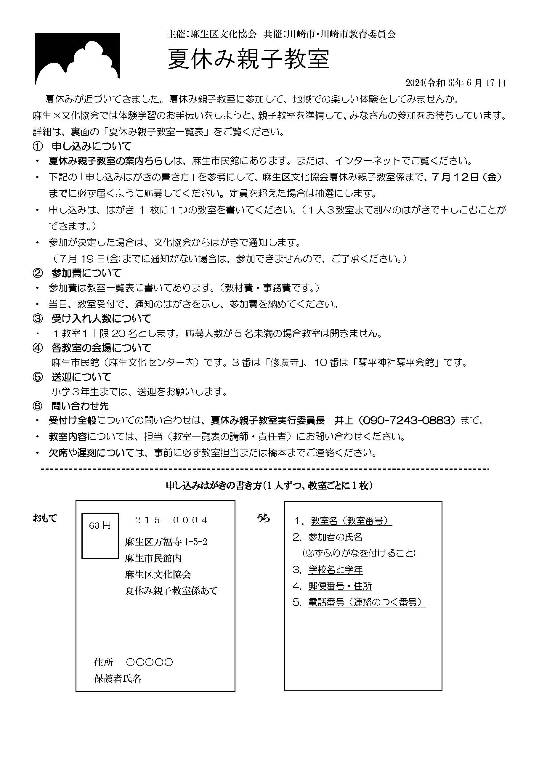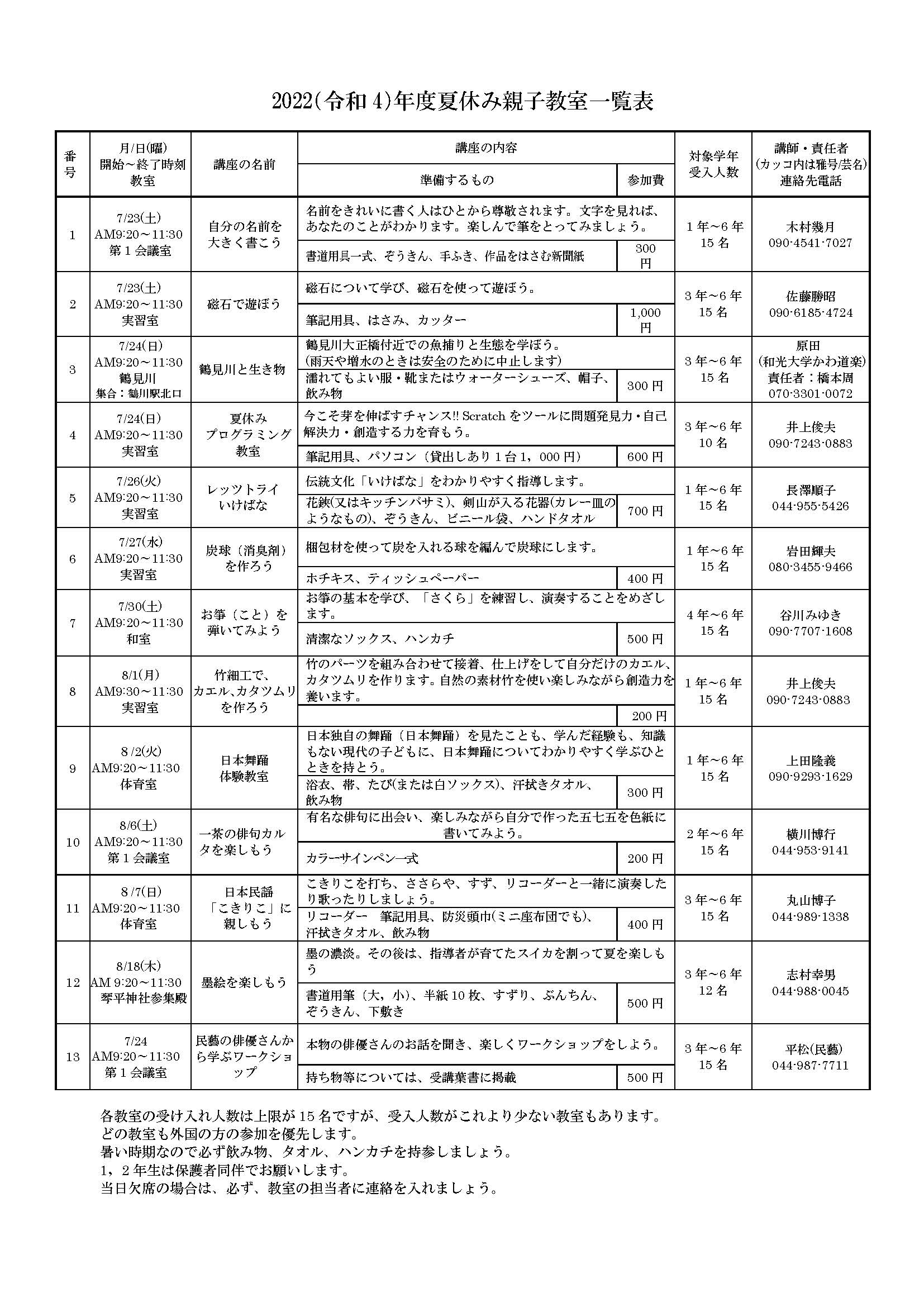 夏休み親子教室案内 教室一覧表 | |||