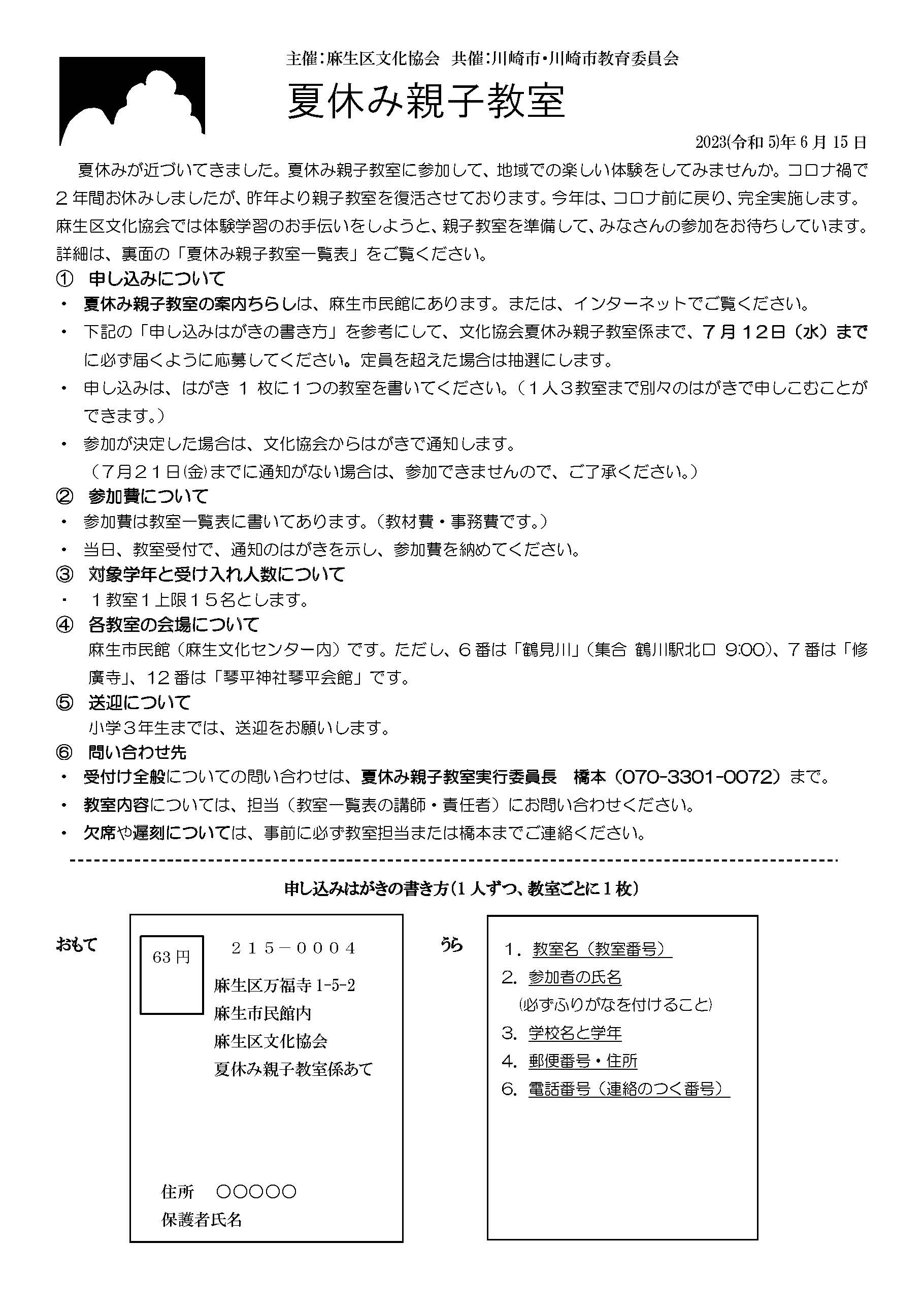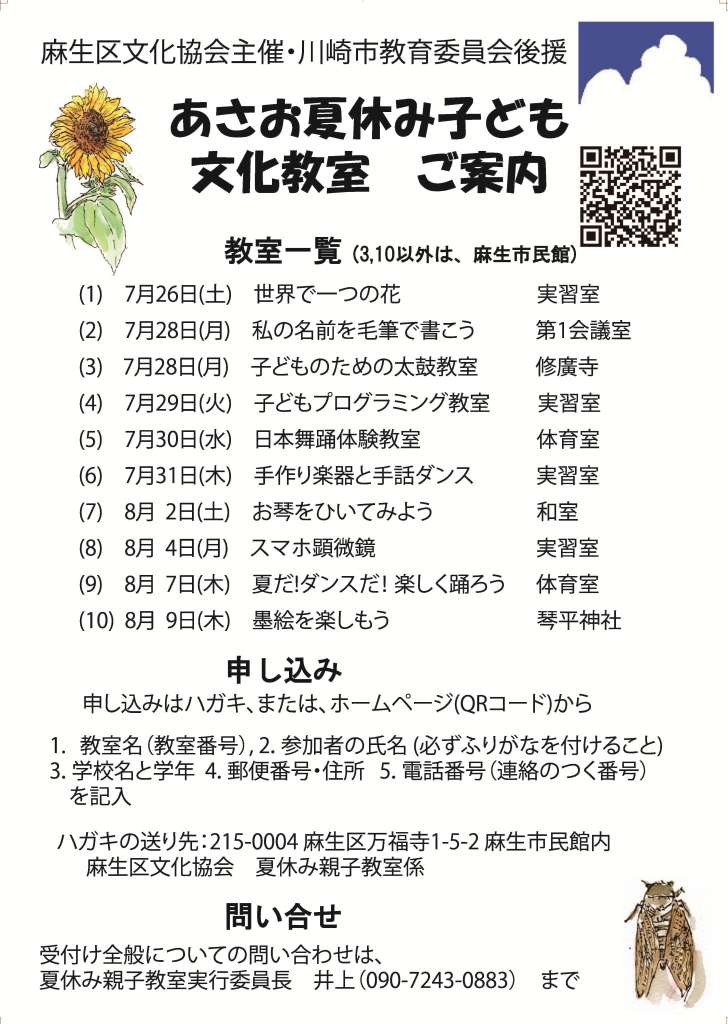 | 2023.06.15 | 今年度の夏休み親子教室を7/25-8/5に麻生市民館で開催します。親子教室のページを作りました。夏休み親子教室の詳細は、 | ![]() 夏休み親子教室案内 親子教室ホームページQRコード | |||