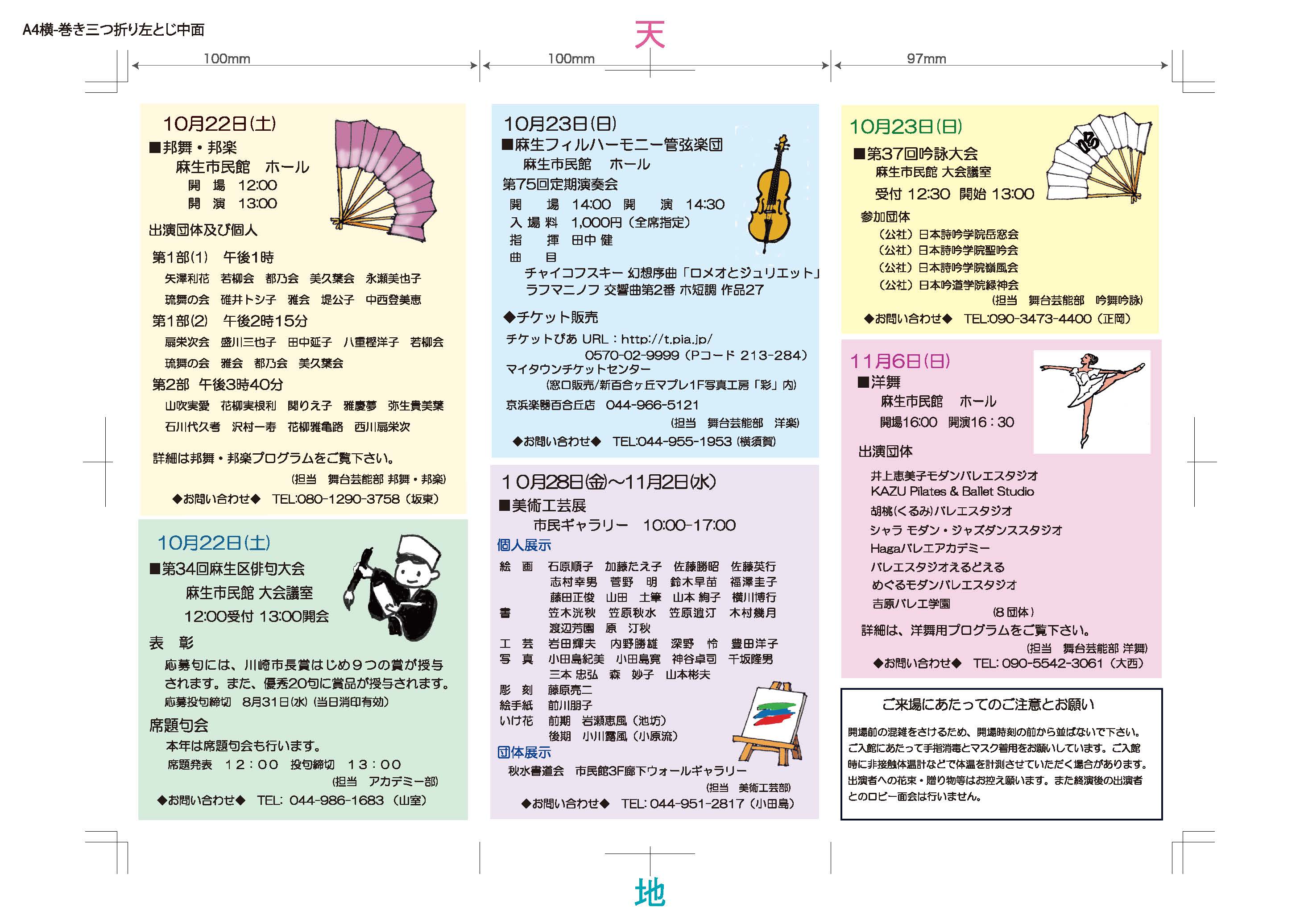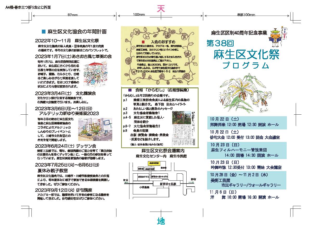 | 2022.08.23 | 第38回麻生区文化祭総合パンフレットができました。 | 総合パンフ(表) 総合パンフ(裏) | |||