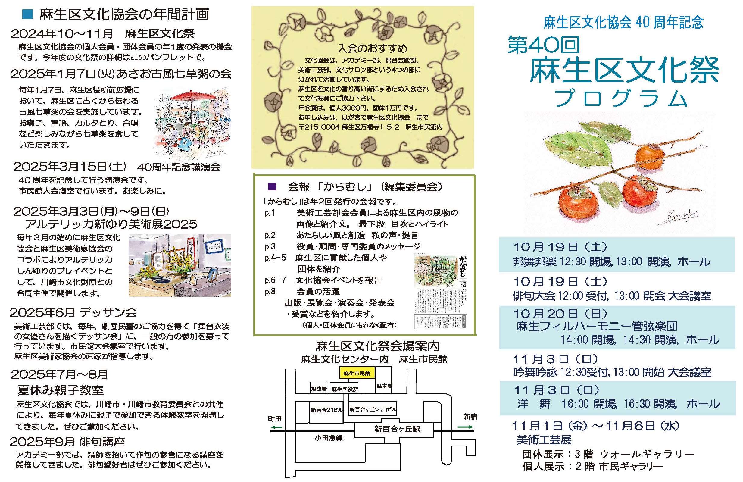 | 2023.08.29 | 第40回麻生区文化祭総合パンフレットができました。 | 総合パンフ(表) 総合パンフ(裏) | |||