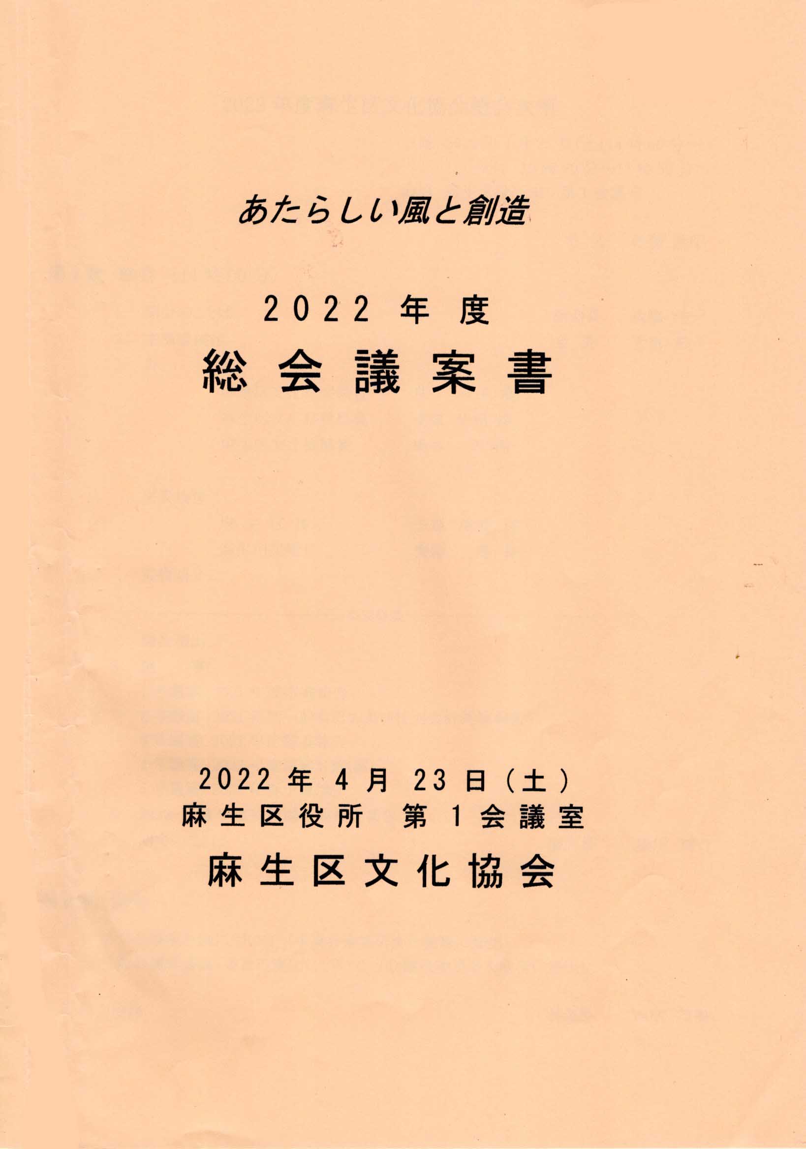 | 2022.04.23 | 2022年度総会が開催され、2021年度事業報告, 2021年度決算書、2021年度特別会計報告書および監査報告書、2022年度事業計画、2022年度予算が審議され承認されました。また、桂米子様・長澤順子様に文化祭奨励賞が、橋本周様に麻生区文化振興賞が授賞されました。 | | |||