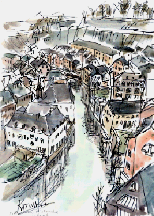 Grund in winter, Christmas market in front of the City Hall, Ru du Marche' aux Herbes, Palais Grand Ducal, Ru du Palais de Justice (Musee National d'Histoire et D'Art), Alzette River(Grund), Eglise Saint Jean du Grund, Banque Centrale du Luxembourg |